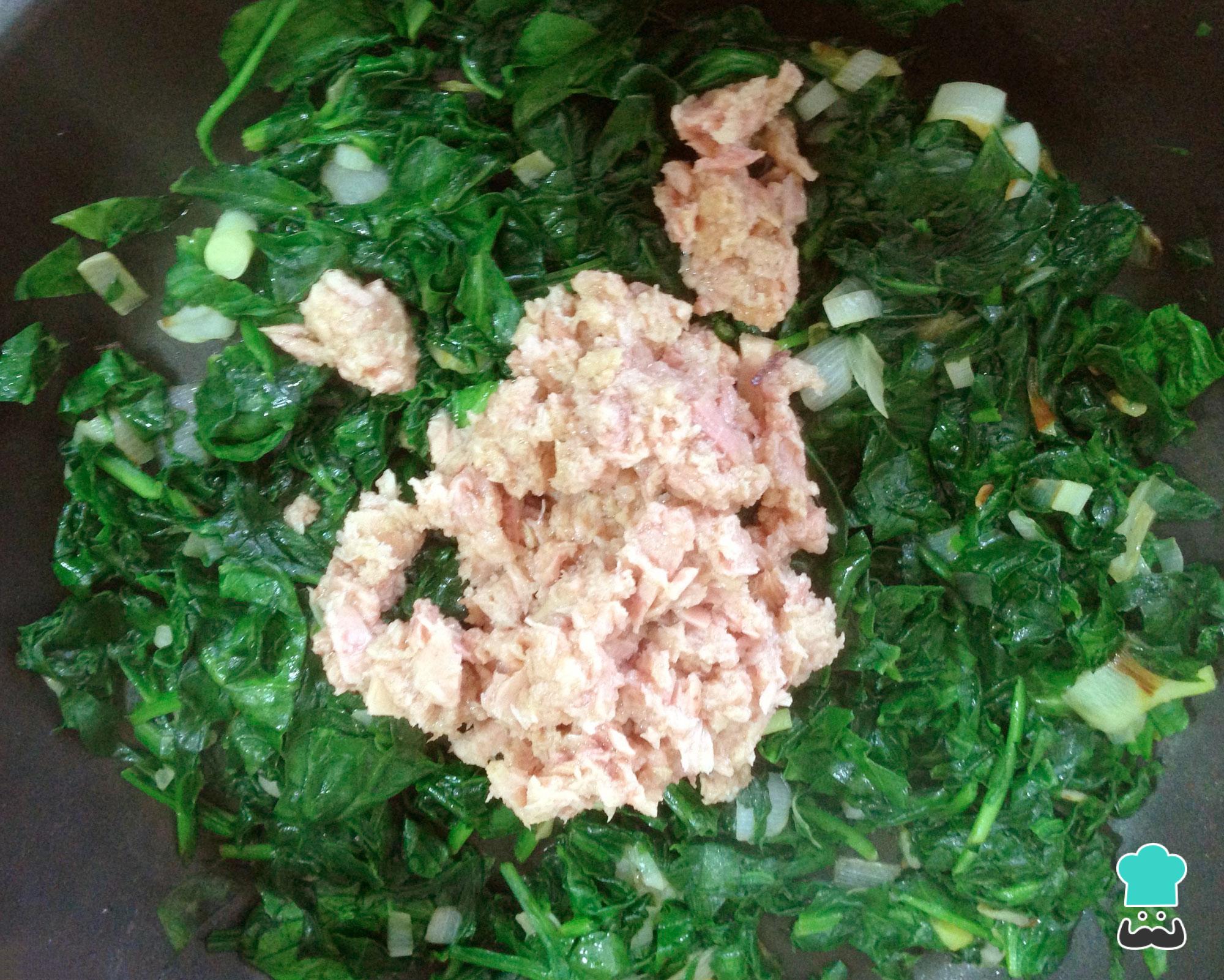 Quando a mistura ficar sequinha desligue o fogo, adicione o atum escorrido e o milho também escorrido e misture tudo. Reserve até amornar e preaqueça o forno nos 180ºC (forno médio).