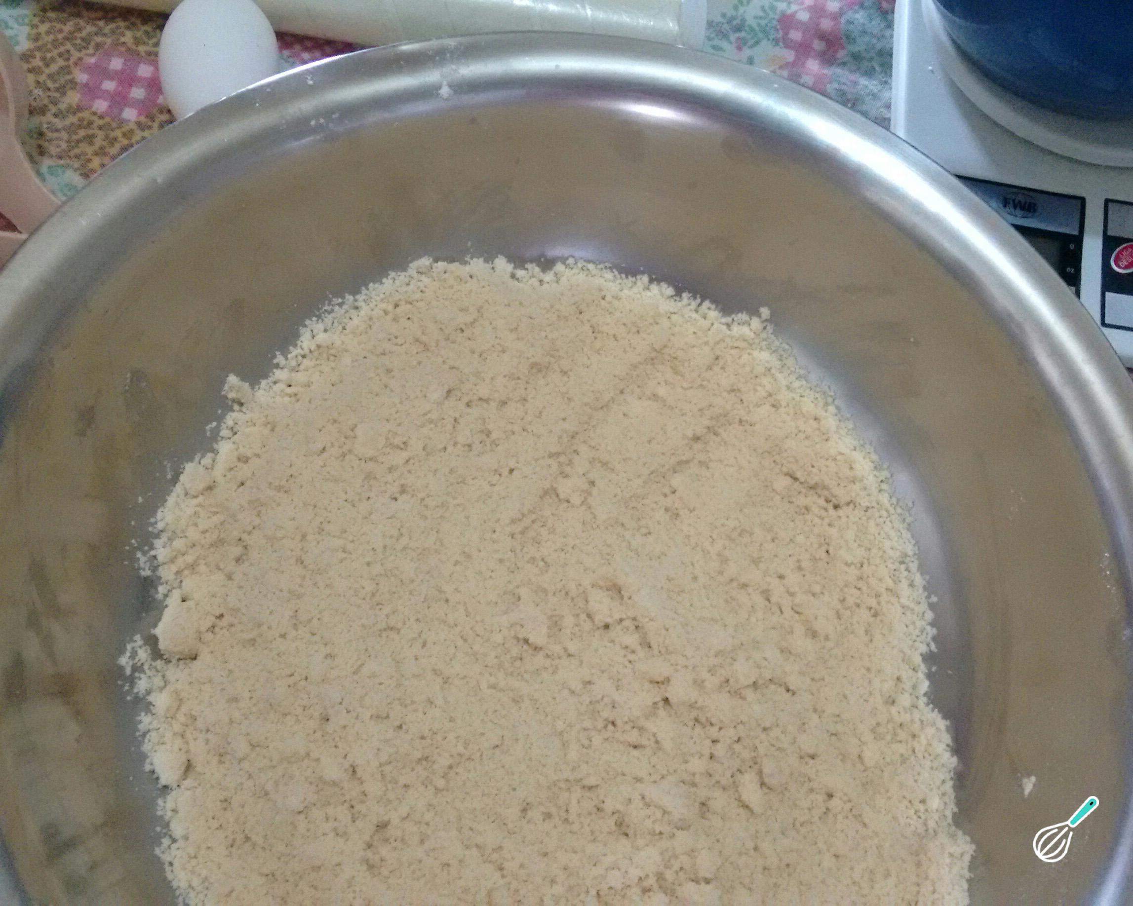 Prepare a massa misturando a manteiga gelada com a farinha de trigo até formar uma farofa.