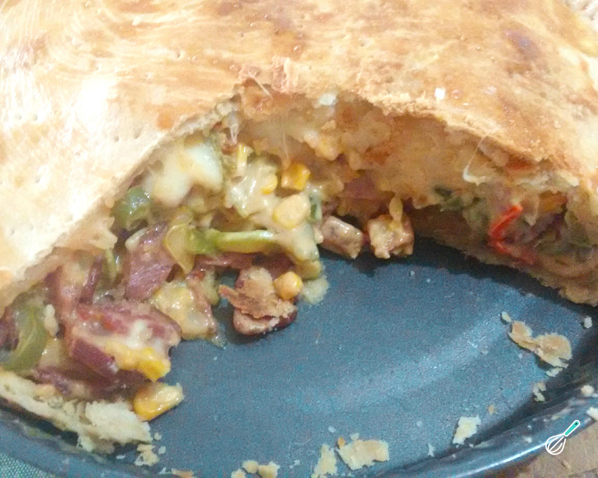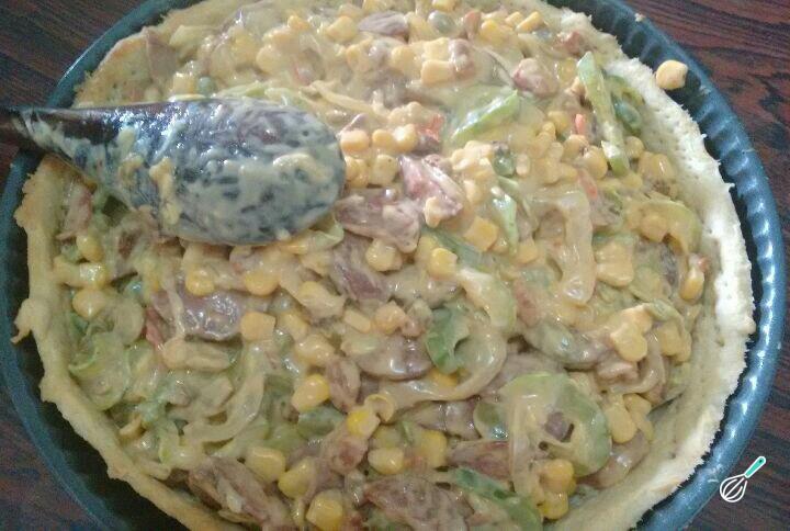 Acrescente ao recheio a calabresa e o bacon e coloque na torta pré-assada, distribuindo bem com a colher.