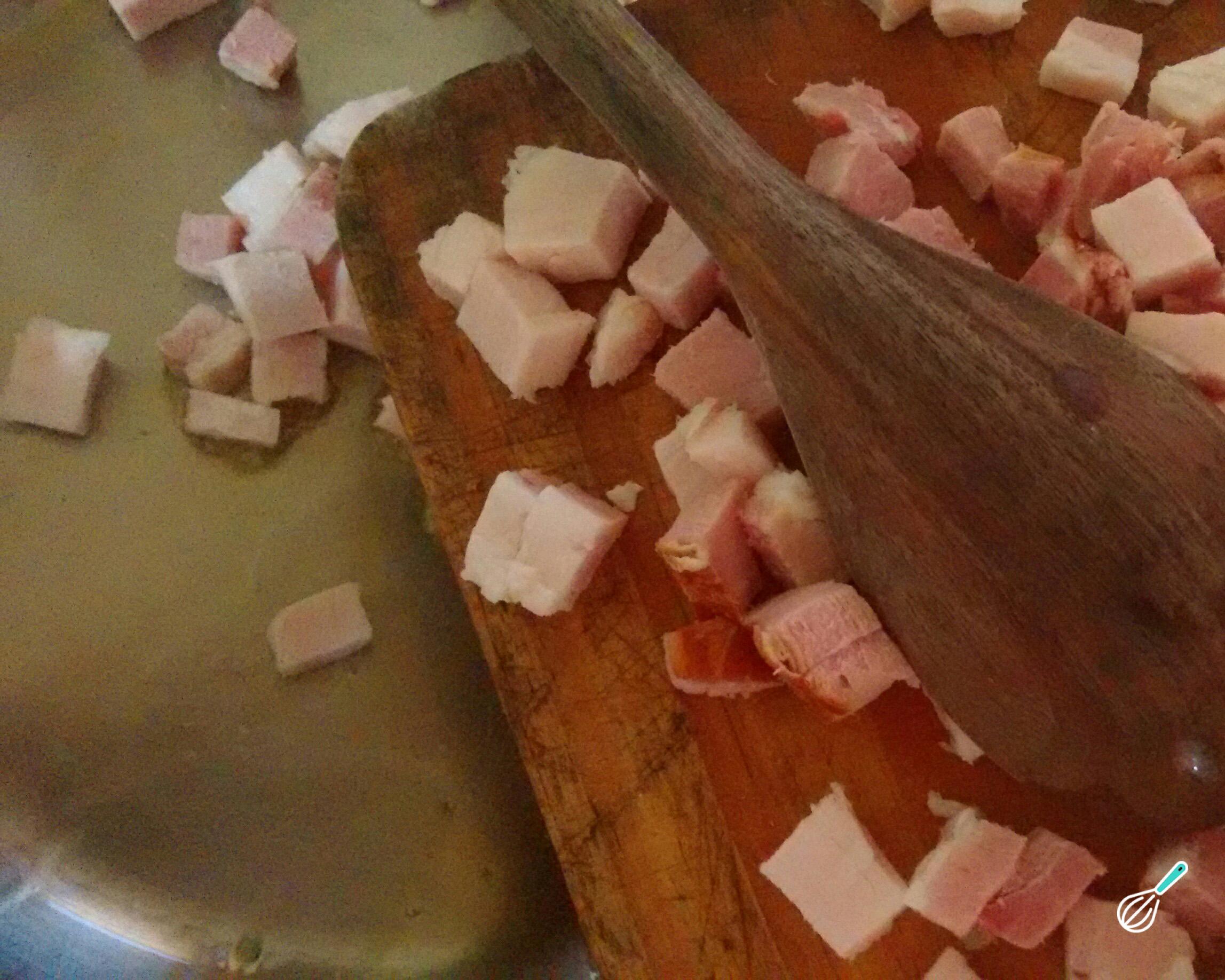Prepare o recheio desta torta de calabresa e bacon comece fritando o bacon e a calabresa até dourar. Reserve e corte os demais temperos.