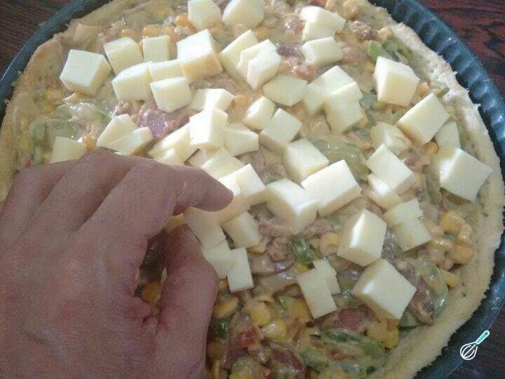 Por fim distribua o queijo muçarela, que sempre combina com receitas de tortas salgadas!