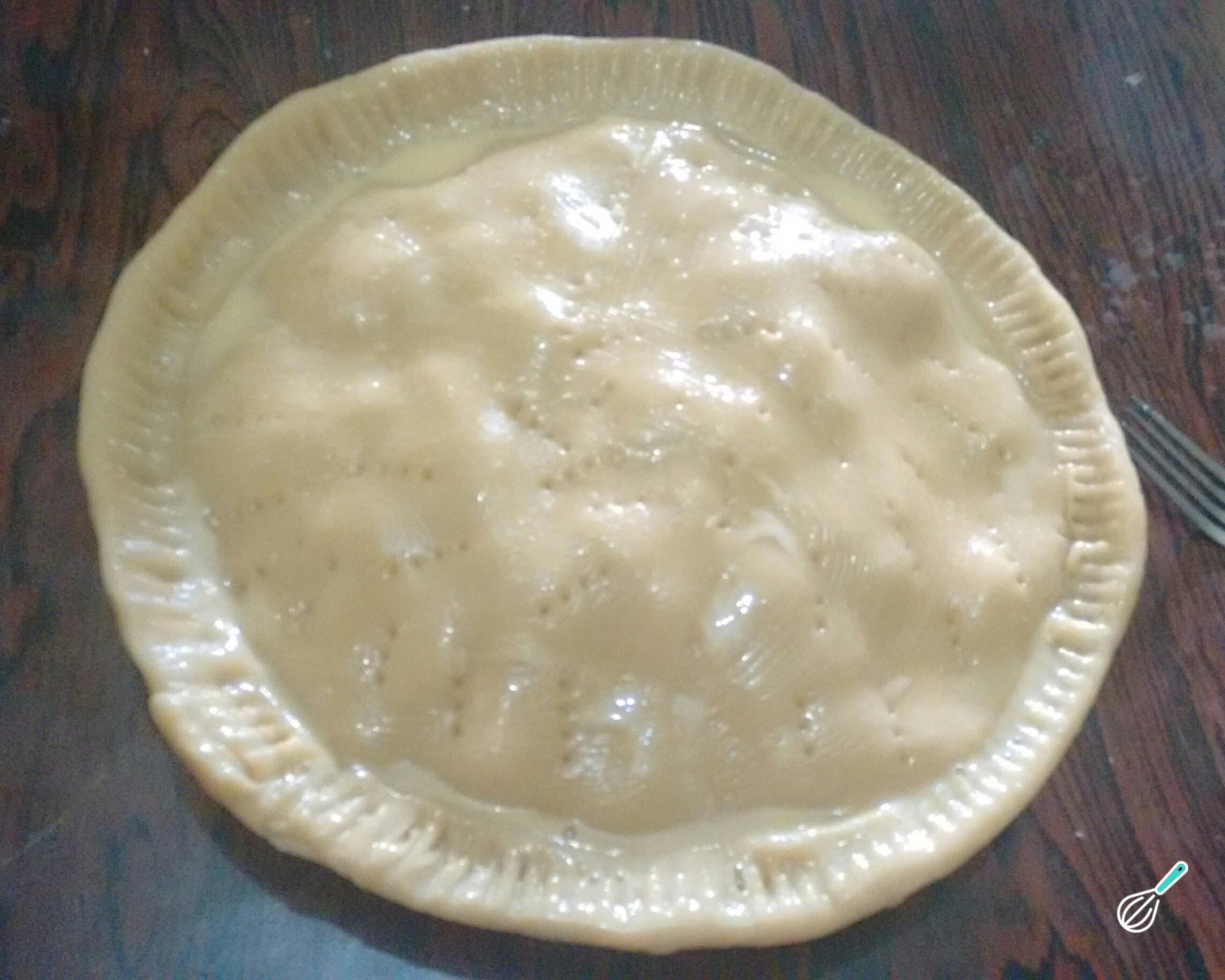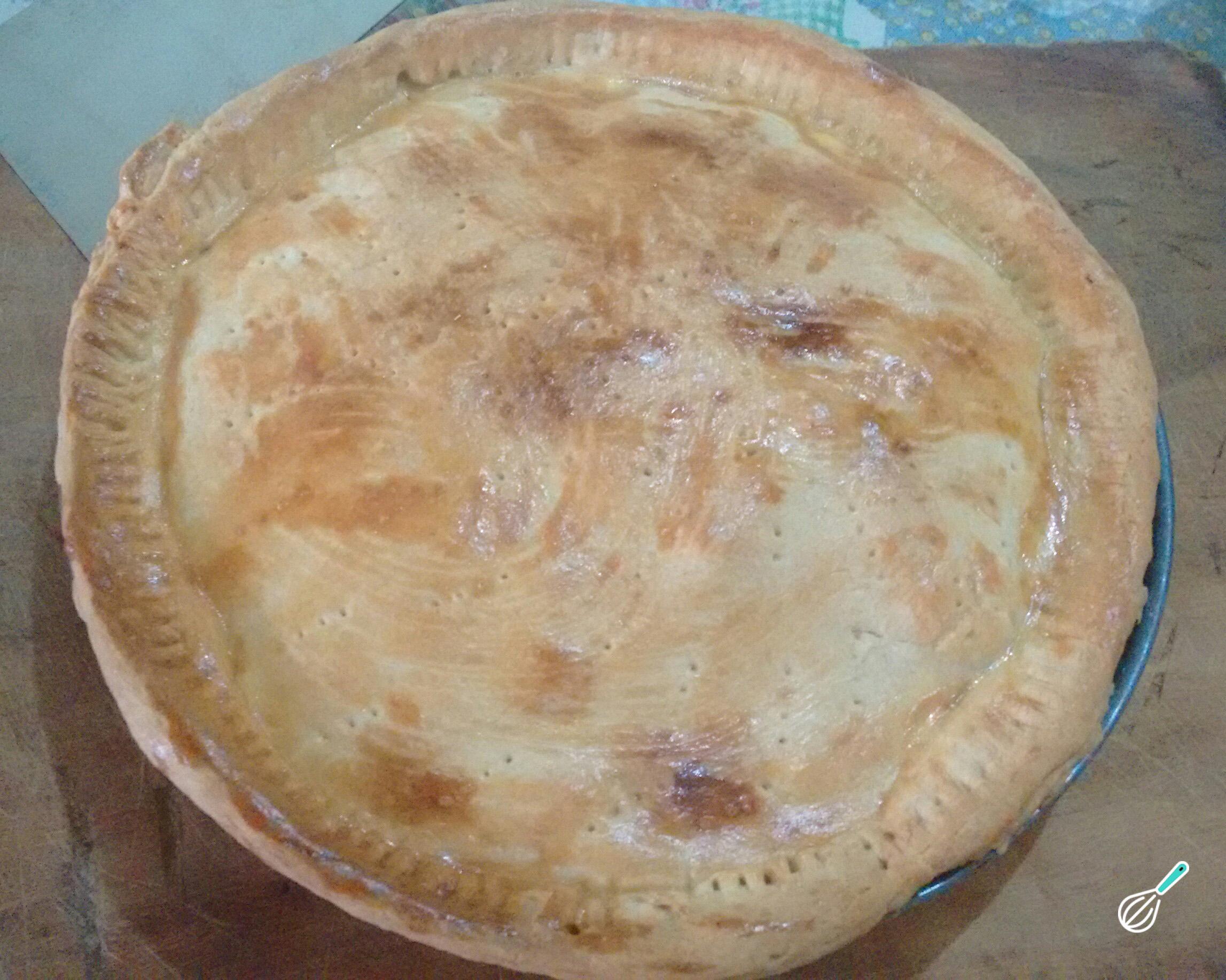 Cubra a torta com o outro disco de massa, pincele com a gema e, novamente fure comum garfo. Leve ao forno por aproximadamente 30 minutos.