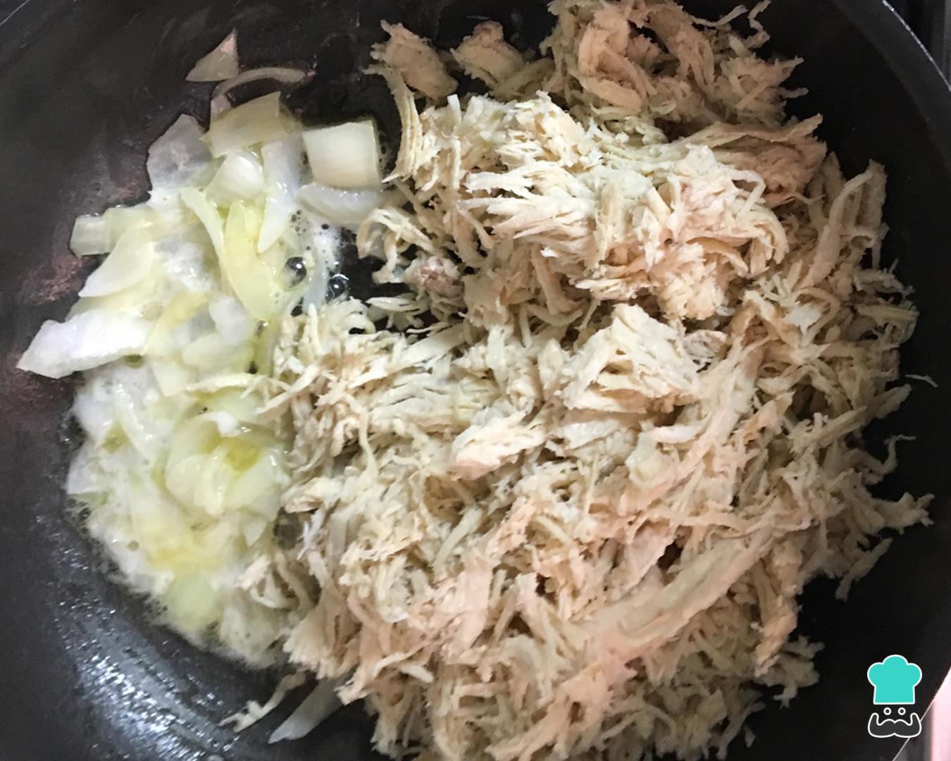Em uma panela com um pouco de óleo prepare o recheio desta torta salgada sem glúten: doure a cebola e o alho, acrescente o frango desfiado e o tomate, acerte o sal e coloque pimenta e orégano a gosto.