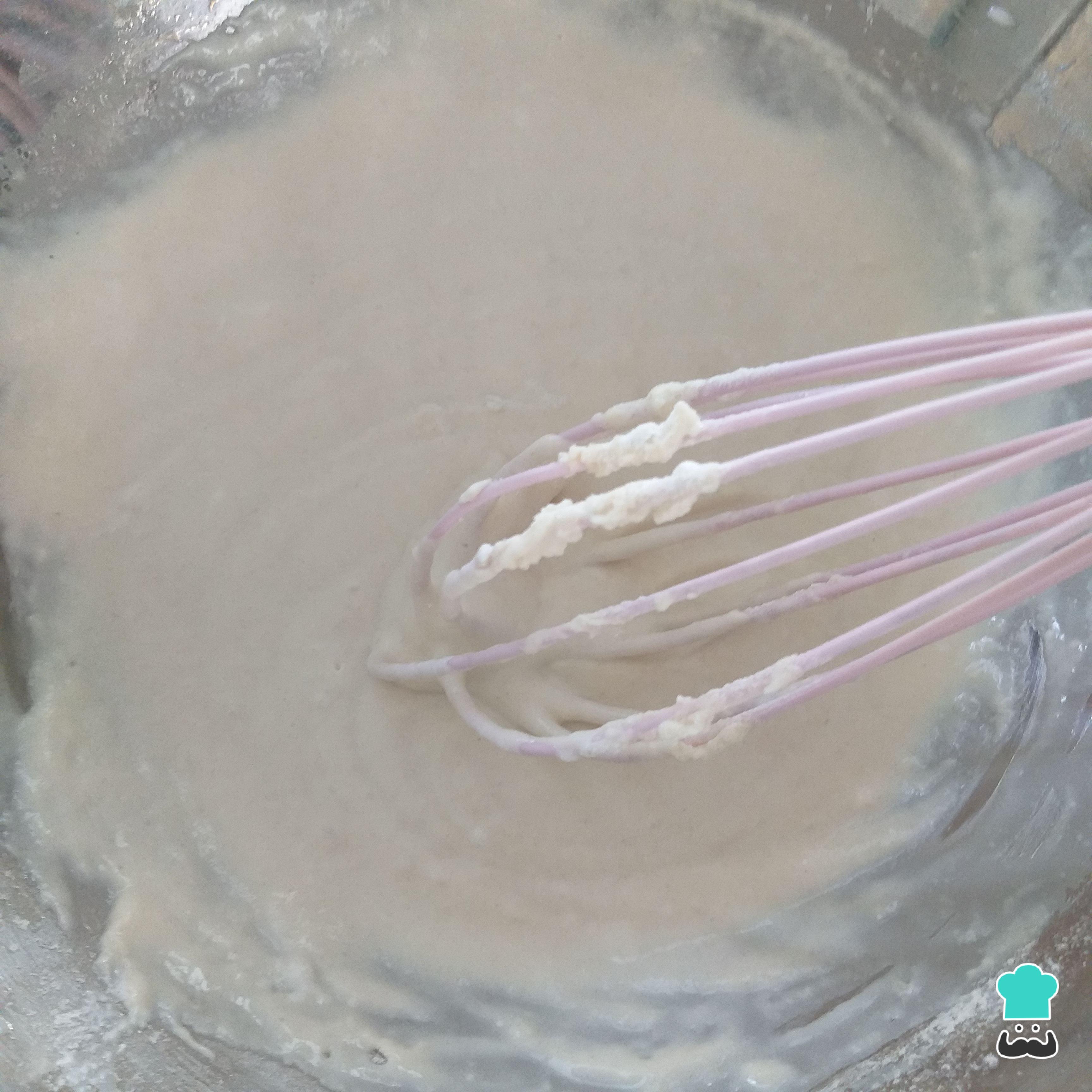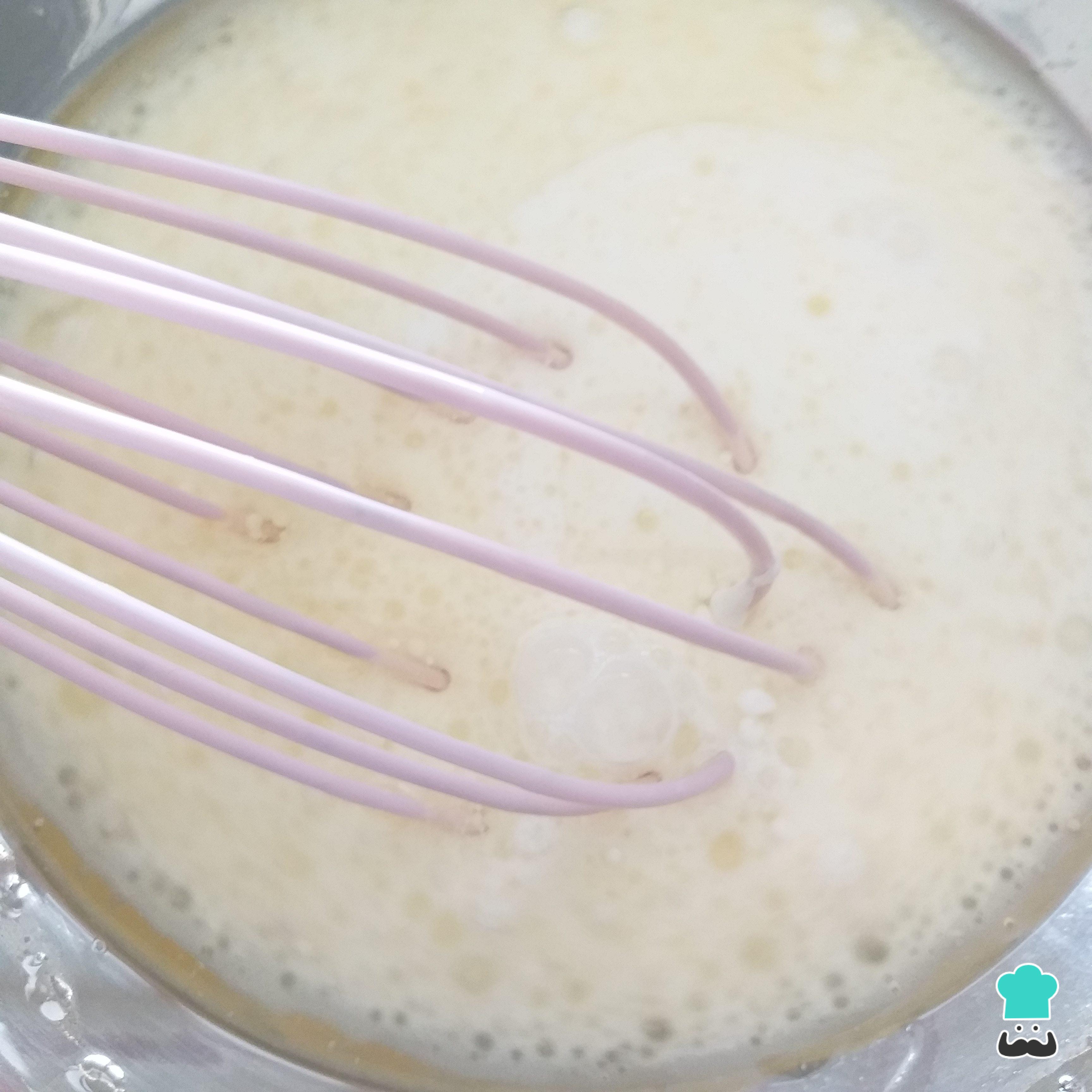 Num recipiente maior misture bem com um fouet ou com um garfo os ingredientes líquidos (o óleo, a água e o leite) e o sal.