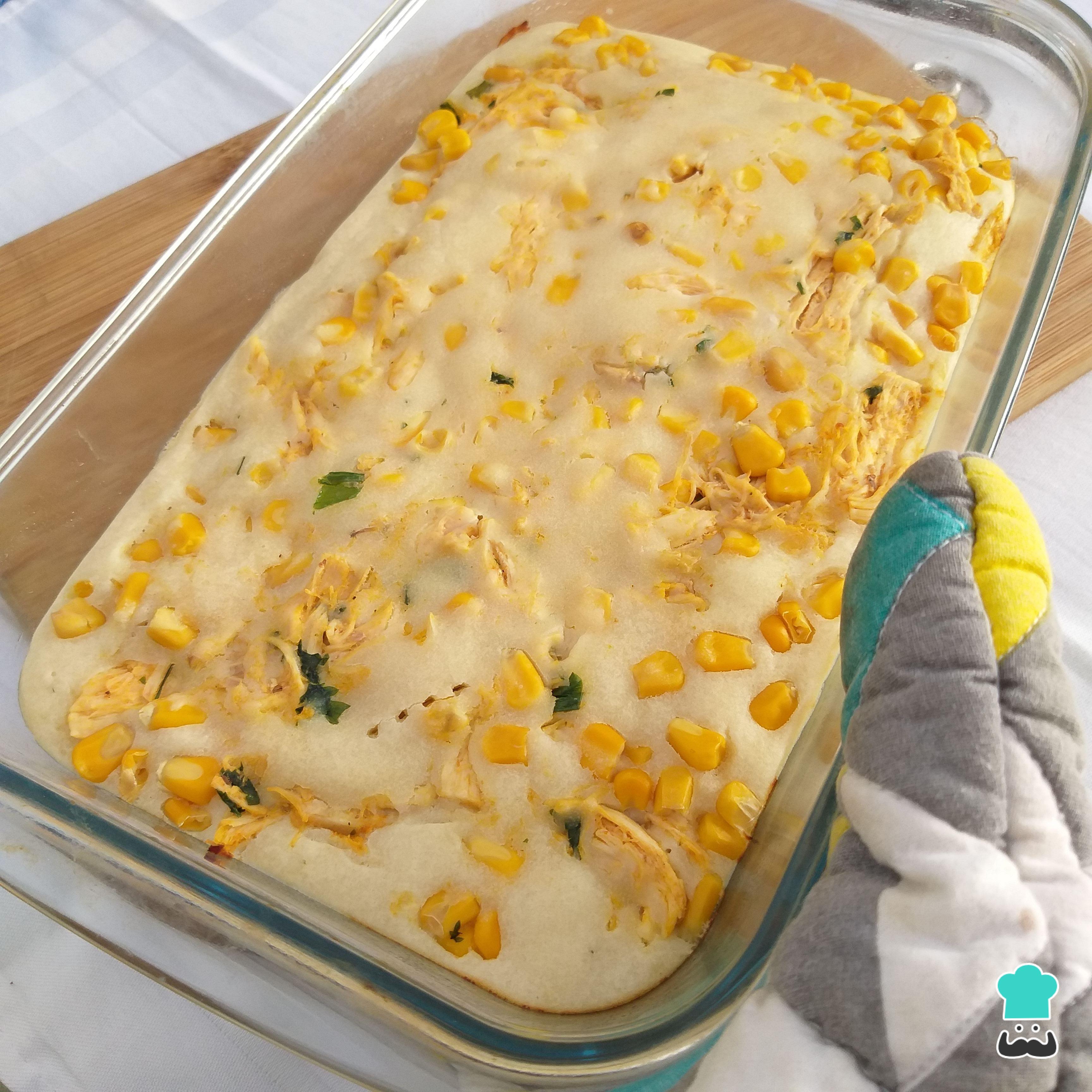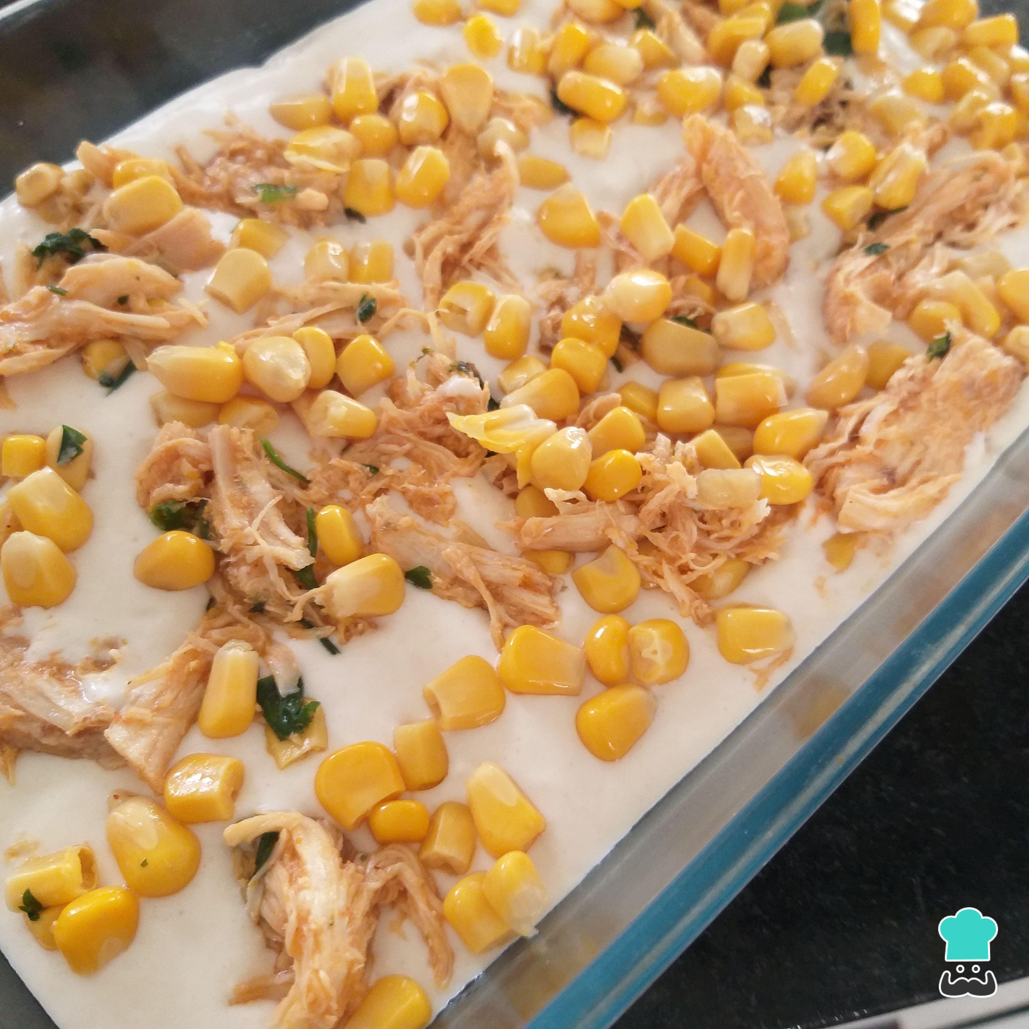 Transfira a massa para uma assadeira untada, cubra com o frango e o milho, polvilhe a salsinha e leve ao forno pré aquecido a 180 graus deixando assar por cerca de 40 minutos.