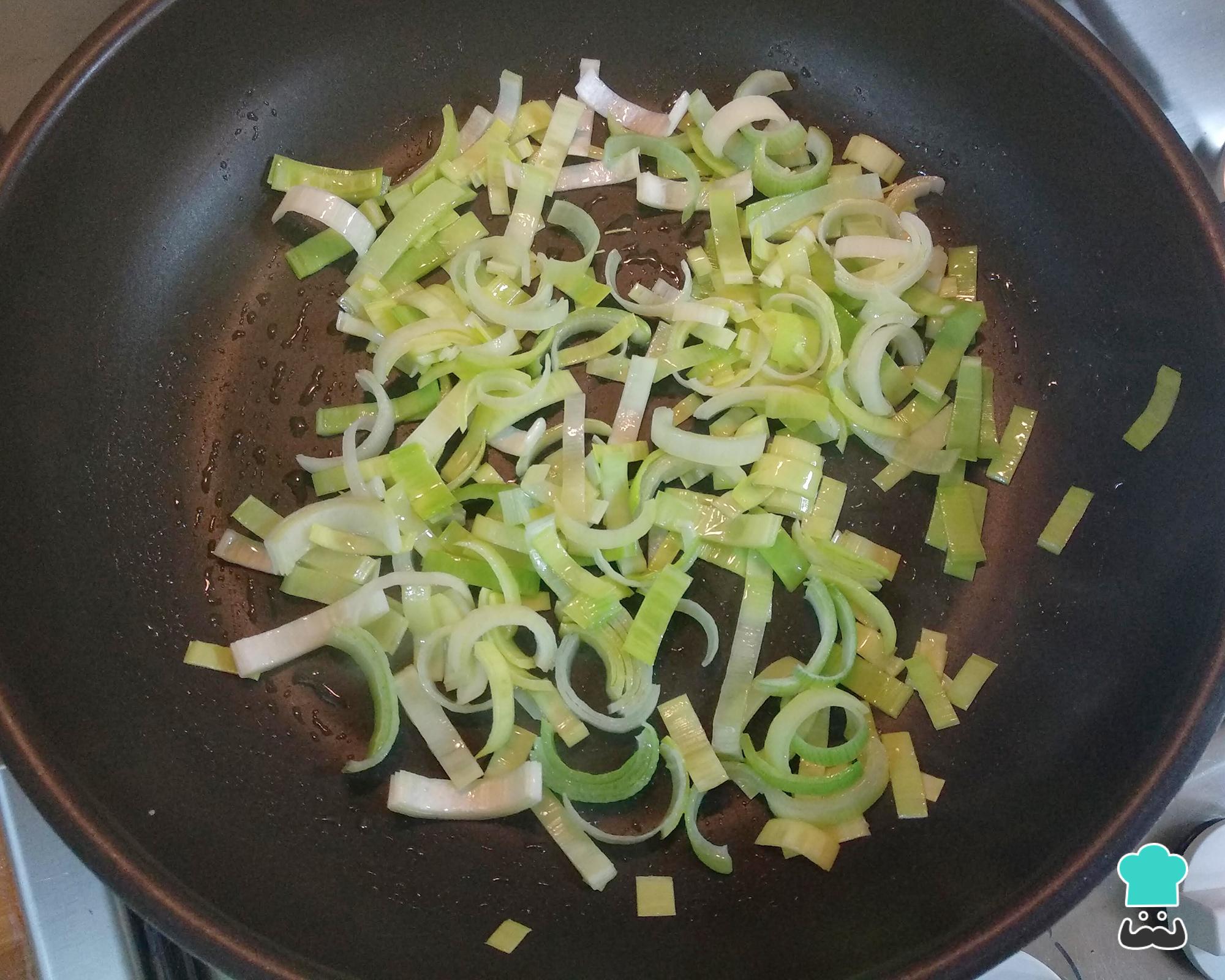 Leve ao fogo uma frigideira com o azeite e refogue o alho-poró até ficar macio.