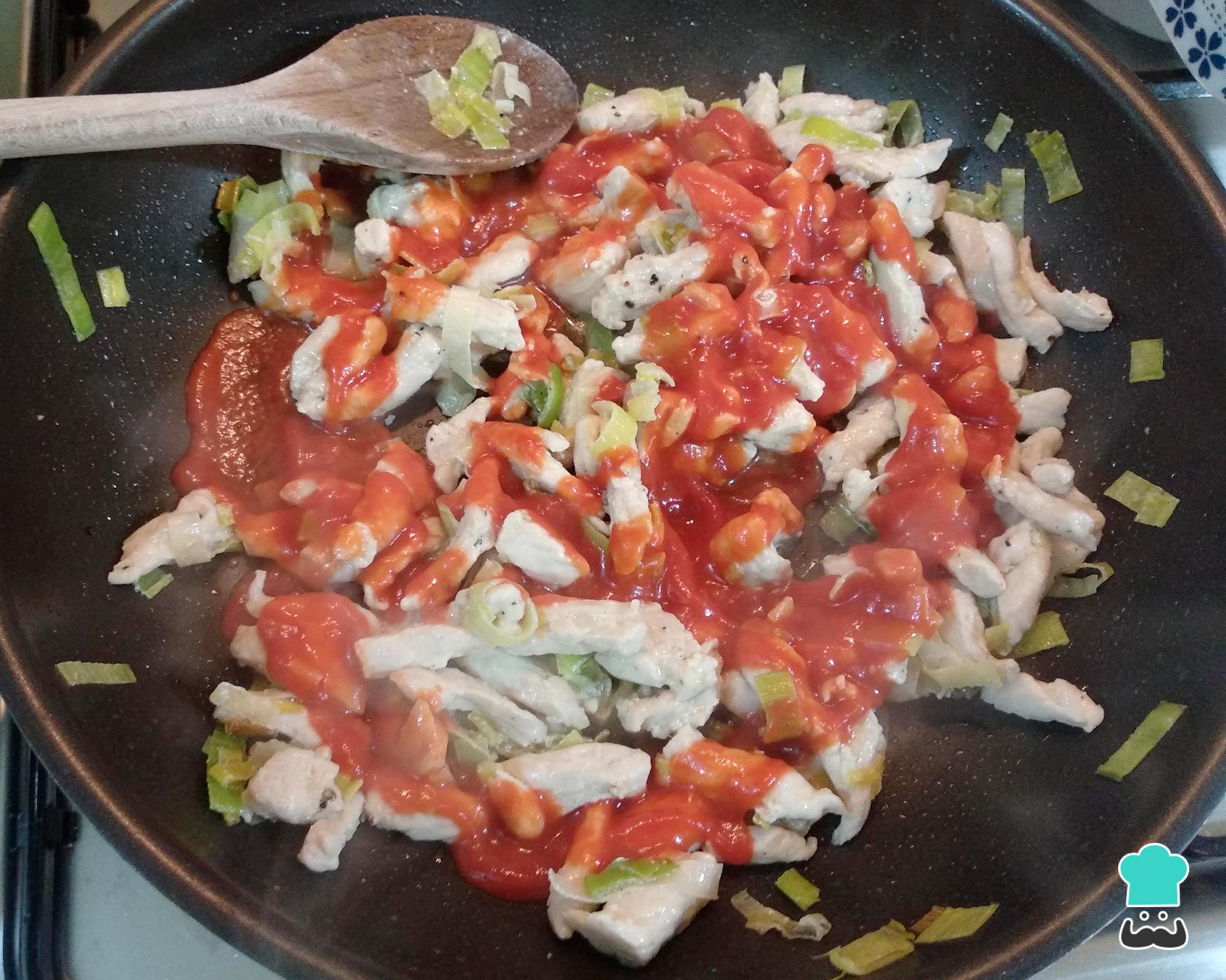 Depois acrescente o frango e tempere com sal e pimenta do reino. Deixe cozinhar, mexendo de vez em quando, até o frango ficar pronto. Depois acrescente o molho de tomate, misture e desligue o fogo.