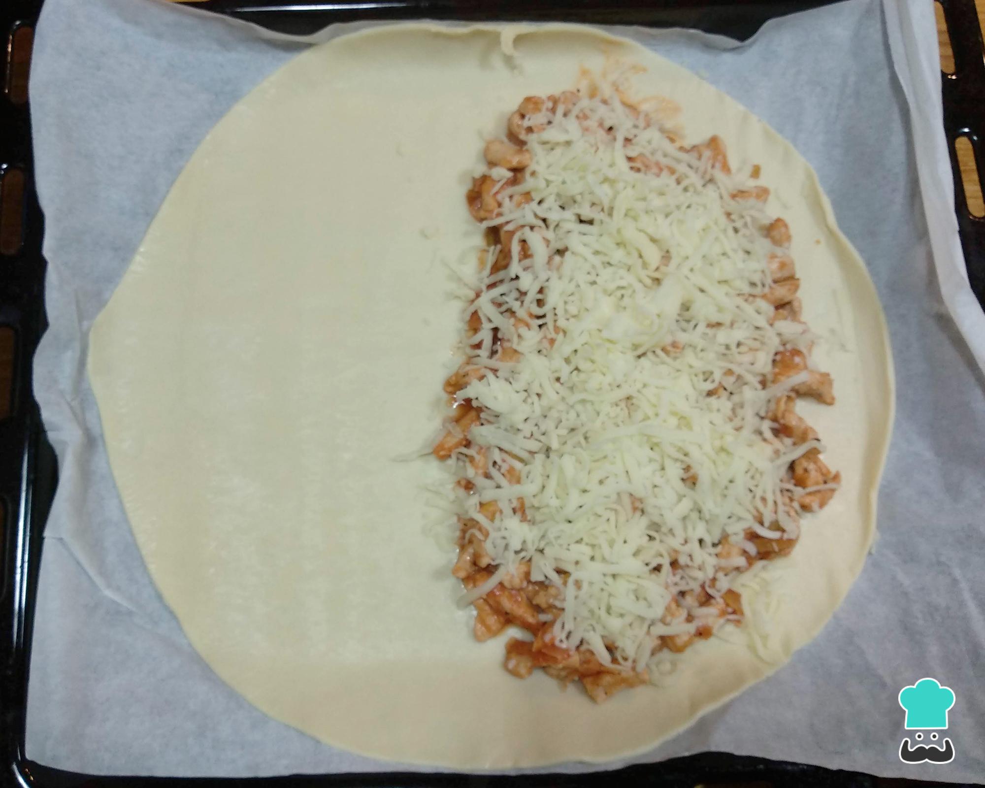 Abra a massa de torta num tabuleiro de forno e coloque a mistura de frango em metade dela, sem chegar nas beiradas. Cubra o frango com o queijo ralado.