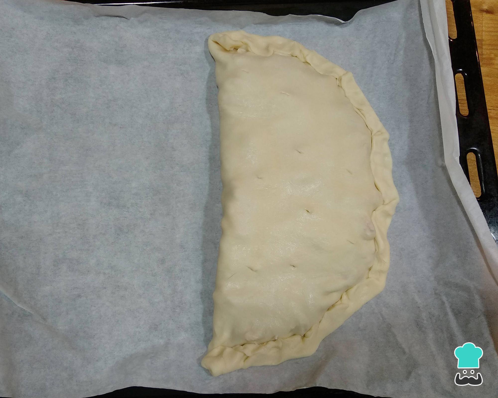 Dobre a massa sobre o recheio e feche as beiradas, como na fotografia. Leve a assar no forno preaquecido a 200ºC por 15 minutos ou até dourar.