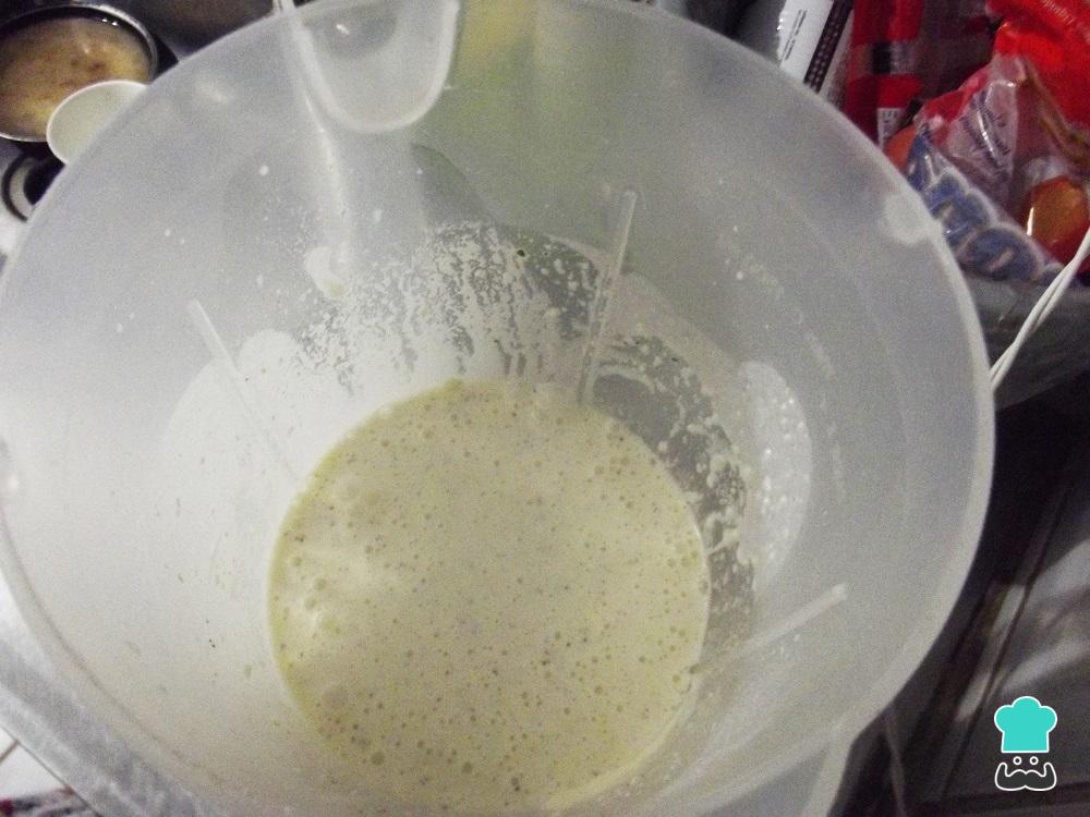 Agora em um liquidificador ou batedeira, bata o óleo, o sal, a farinha, o amido, o fermento e os ovos.