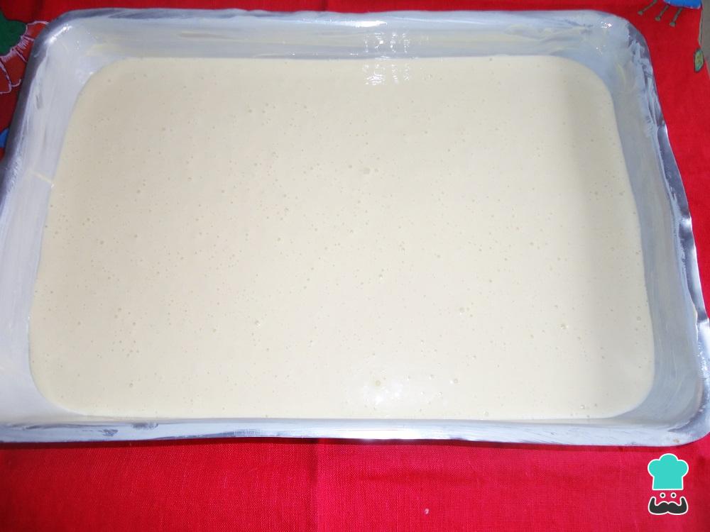 Coloque metade da massa em uma forma untada com manteiga e farinha.