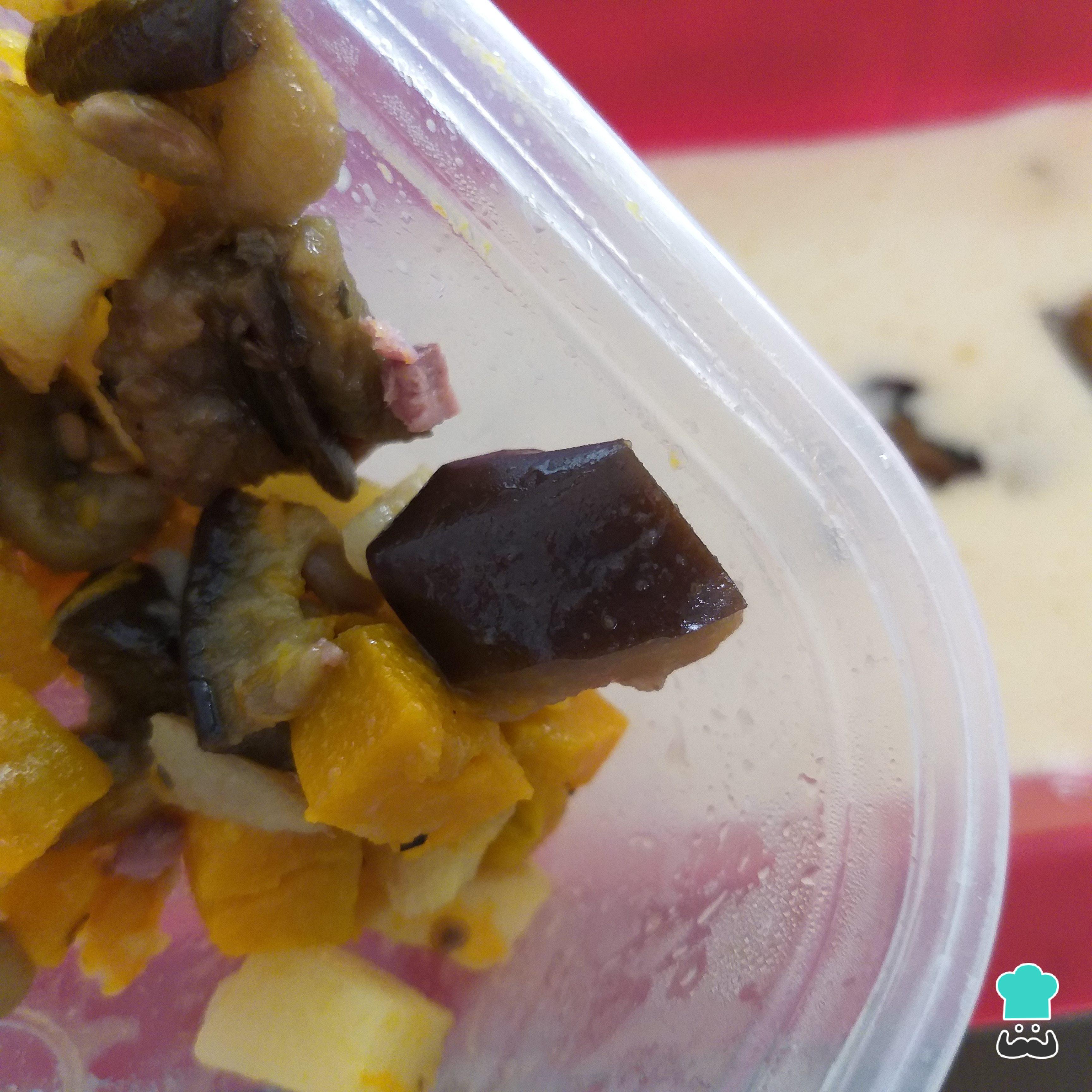 Dica: Eu usei cerca de meia xícara de chá de sobras de legumes cozidos que eu tinha em casa (berinjela, abóbora, batata), mas você pode usar outro recheio da sua preferência desde que seja sequinho, para não interferir com a consistência da massa.