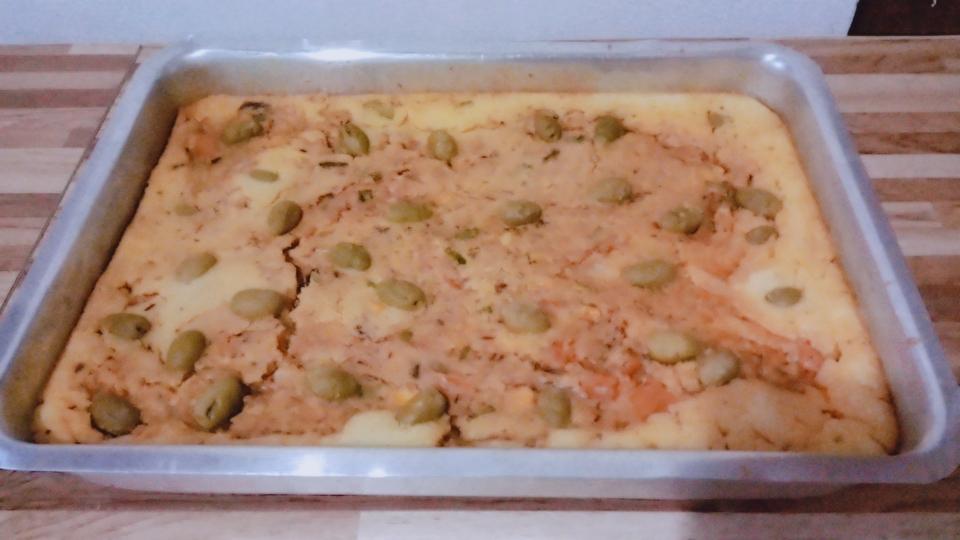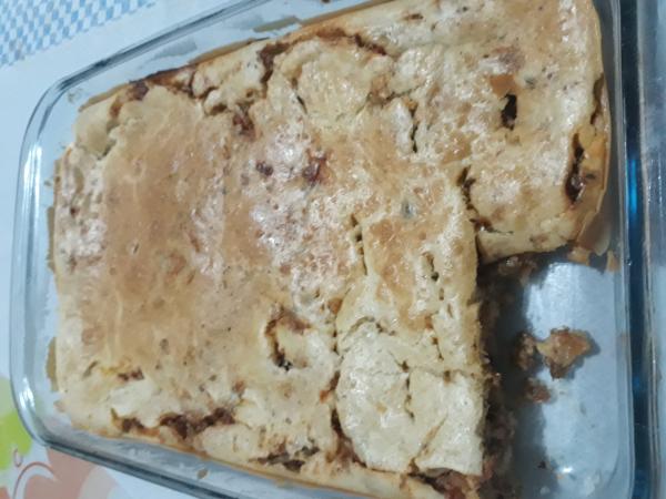 Unte e enfarinhe uma assadeira e coloque nela metade da massa batida no liquidificador. Coloque o refogado de sardinha por cima e cubra com a restante massa. Coloque assando no forno pré-aquecido a 180ºC durante 40-45 minutos ou até dourar.