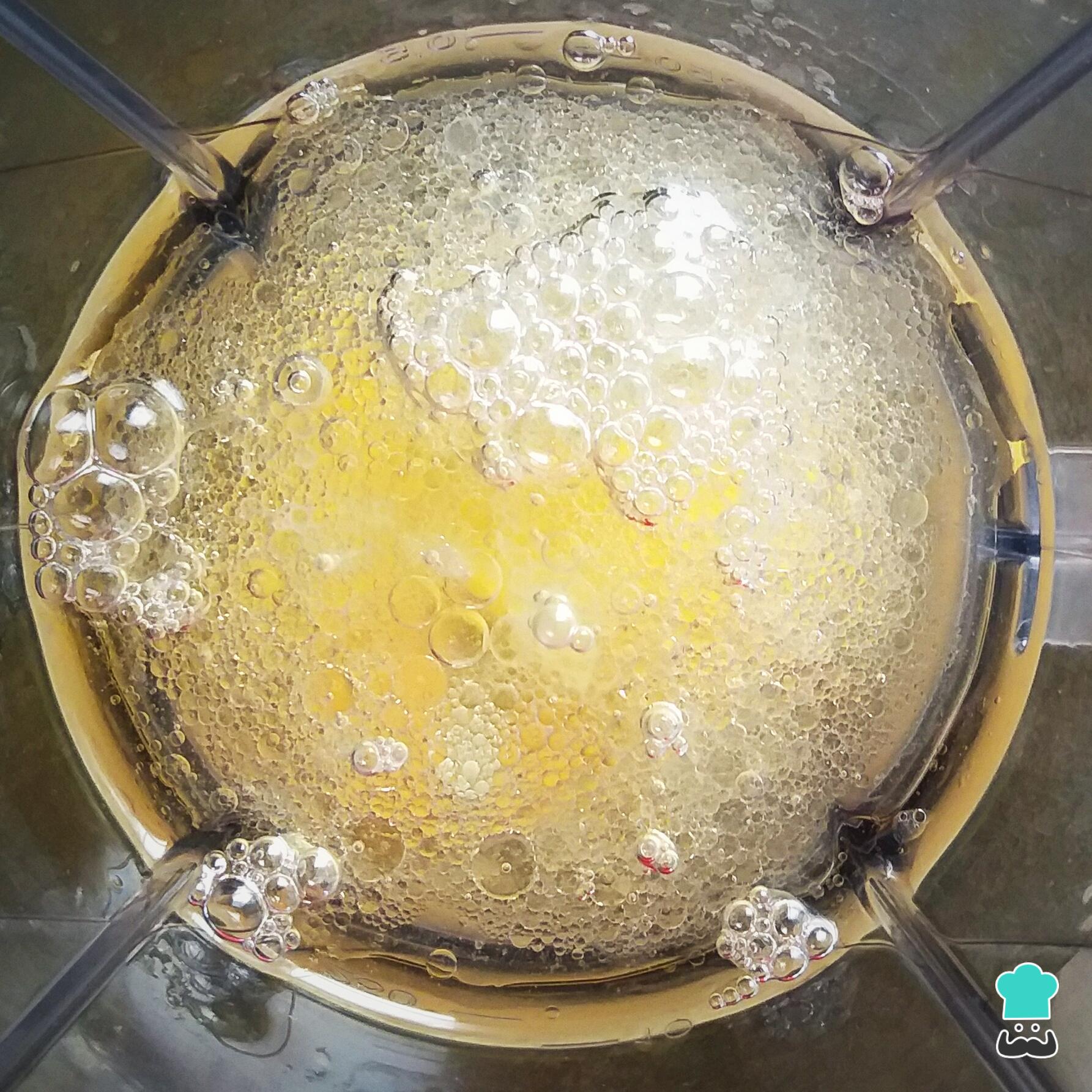 Bata no liquidificador: os ovos, o óleo, a água e o sal até espumar, como na foto.