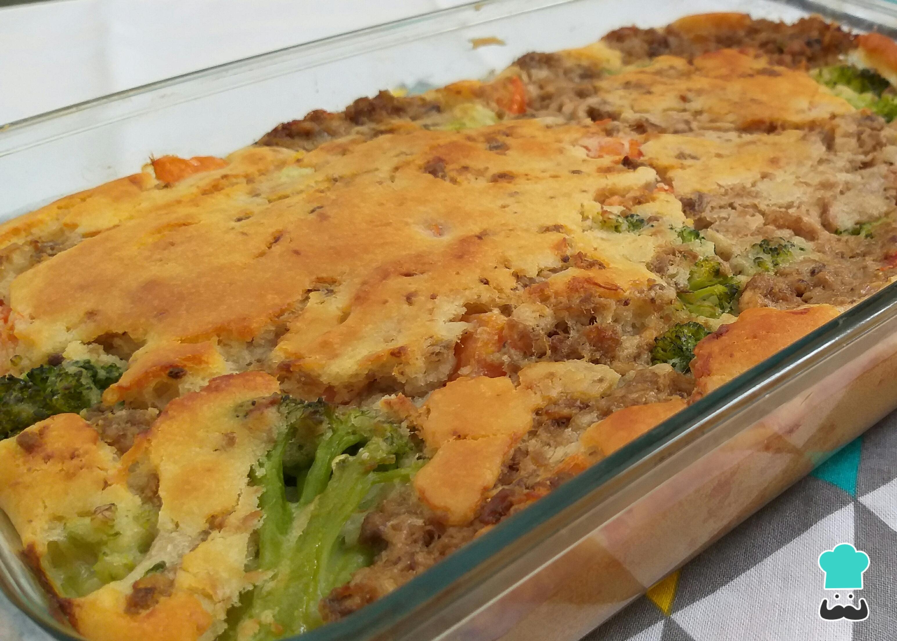 Transfira a massa para uma assadeira e cubra com o recheio. Varie o recheio conforme sua preferência! Neste caso usei brócolis, tomate picados e atum, mas você pode utilizar também frango desfiado, carne seca, seleta de legumes, entre outras opções.