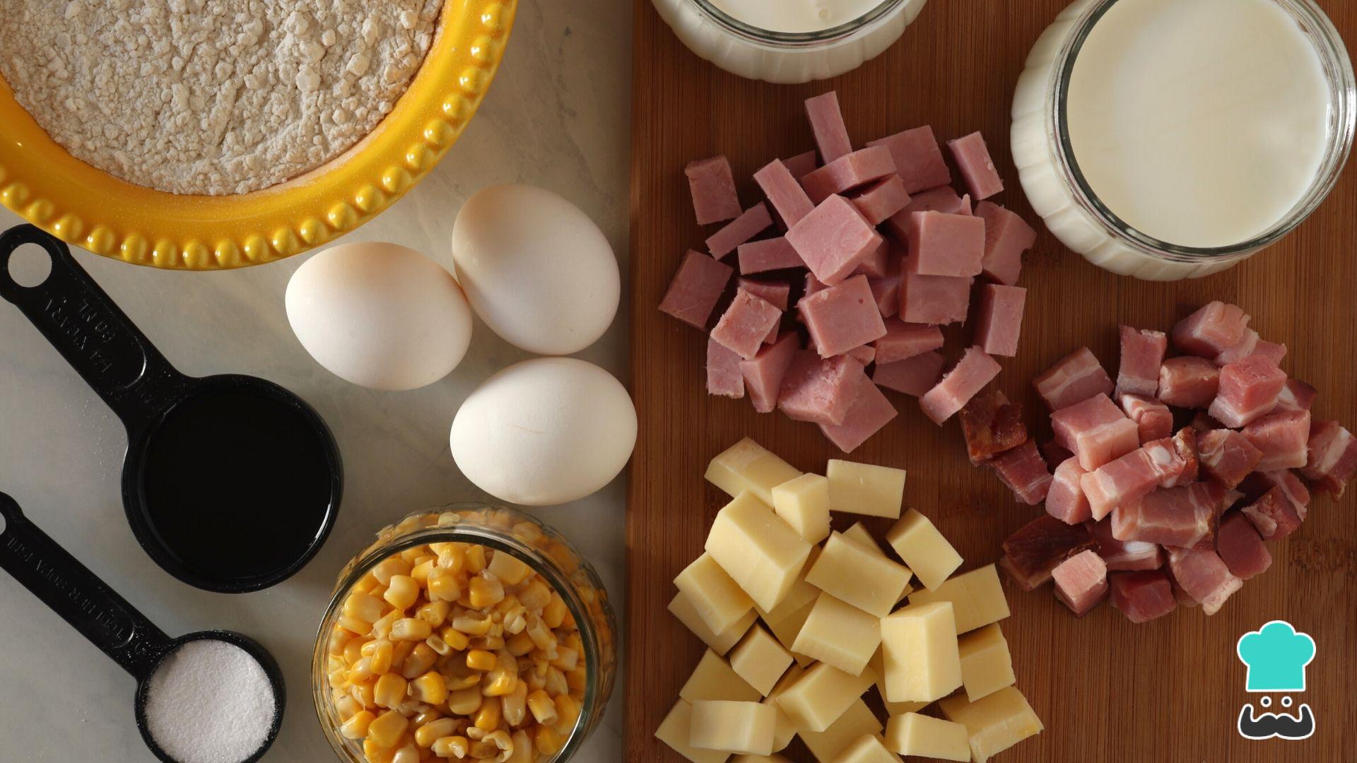 Separe os ingredientes. A muçarela, o presunto e o bacon devem ser cortados em cubos.