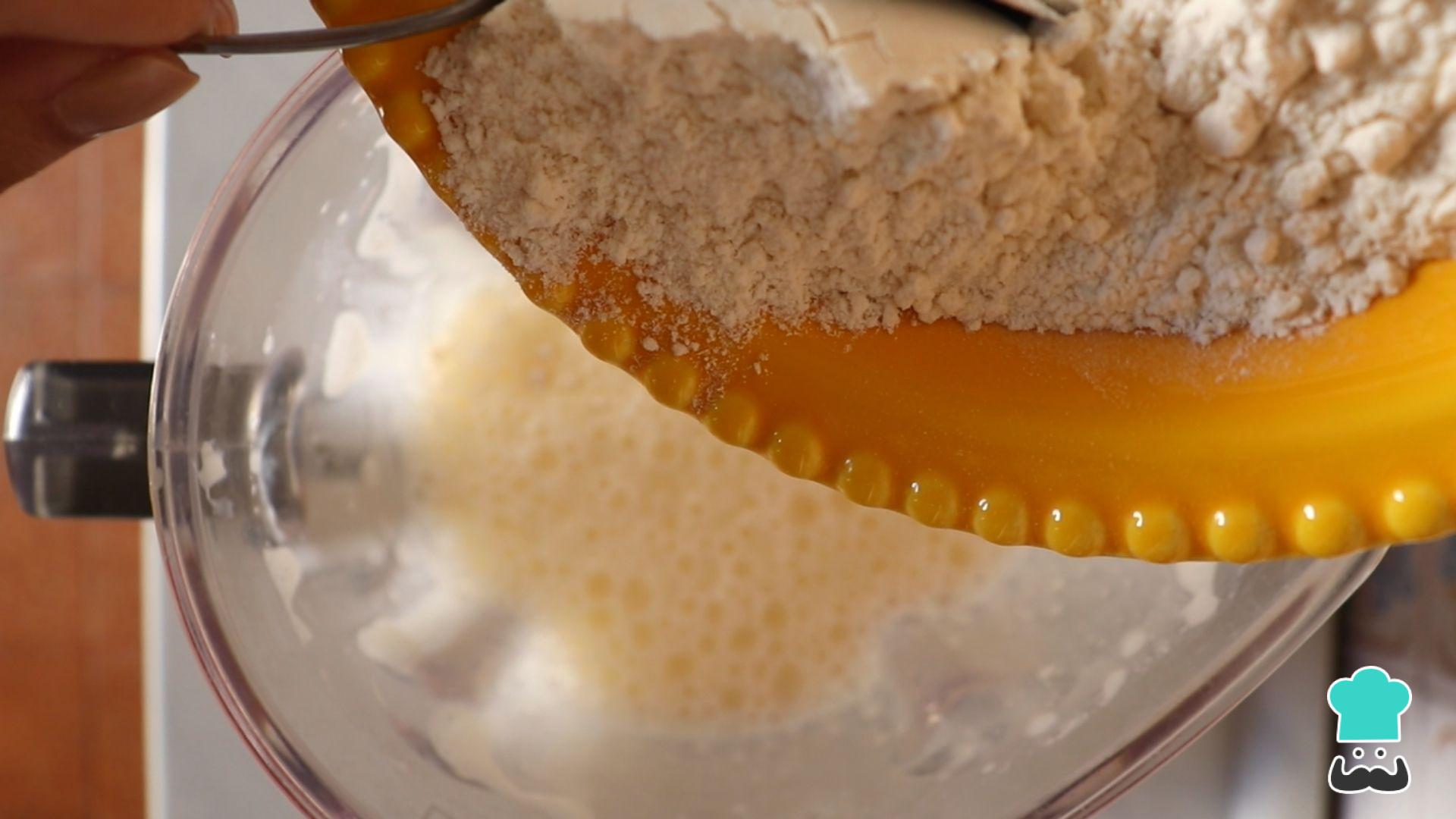 Em seguida acrescente os secos: a farinha de trigo, o sal e o fermento. Bata até não restar nenhum gruminho da farinha. Se necessário, desligue o liquidificador e raspe as laterais para tirar a farinha grudada no copo.