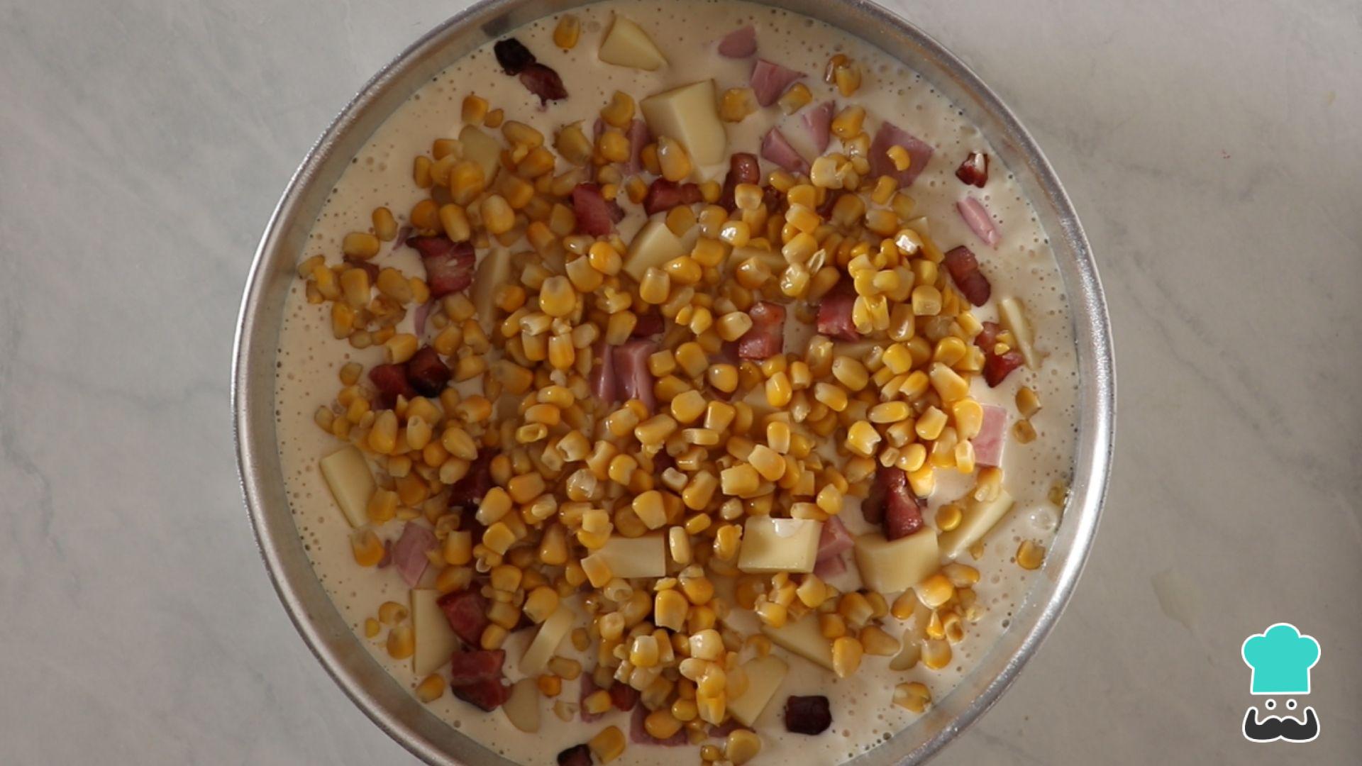 Espalhe todo o recheio por cima da massa: o presunto, a muçarela, o bacon e o milho verde escorrido.
