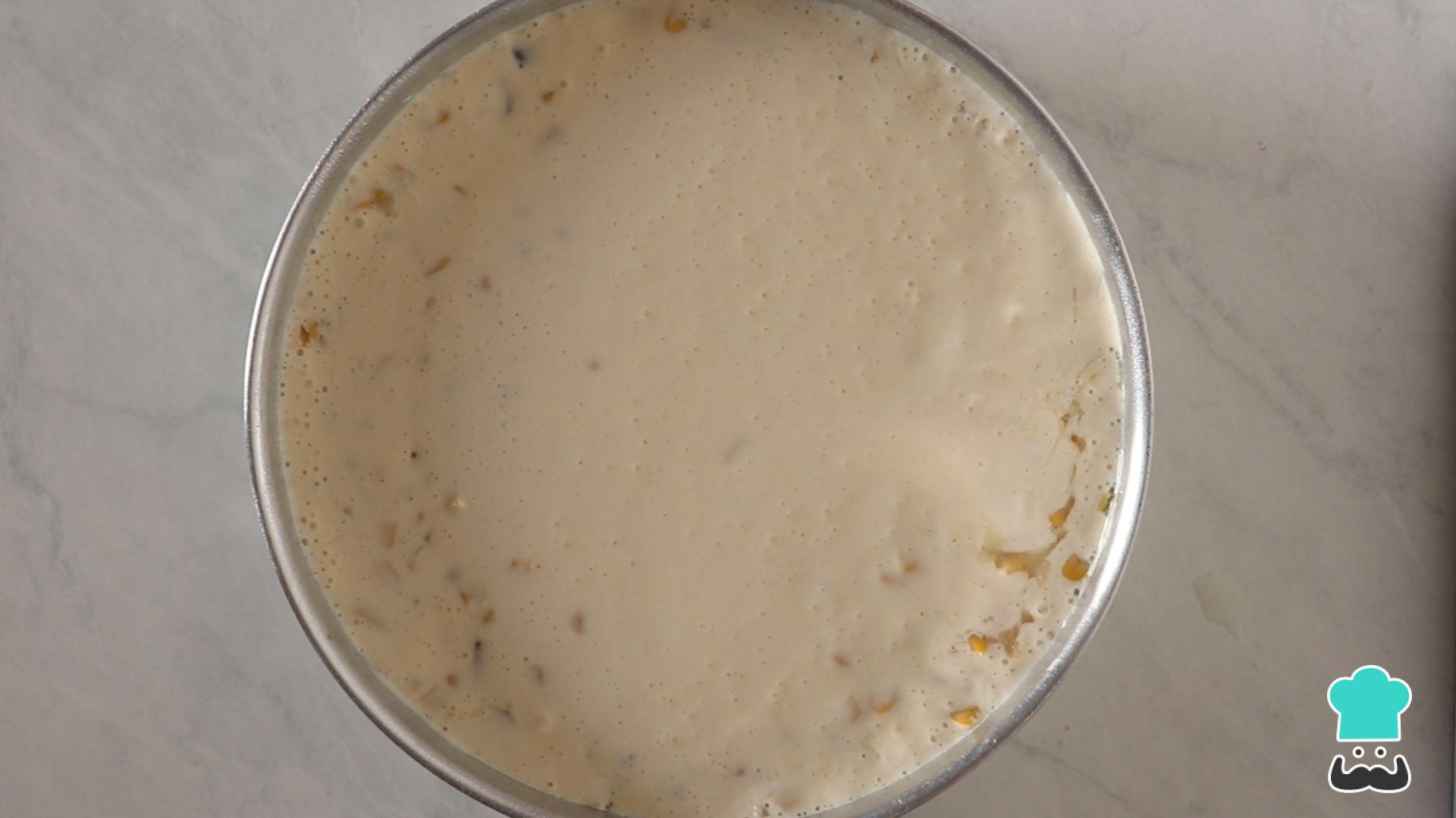 Vamos começar pela massa, que é super simples e rápida. Comece batendo os líquidos no liquidificador: leite, creme de leite, óleo e os ovos também. Misture bem!