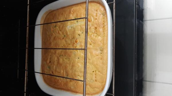 Unte com óleo e polvilhe maisena numa forma média. Coloque metade da massa preparada no liquidificador, acrescente o recheio sobre ela e cubra o recheio com a restante massa. Leve para assar no forno preaquecido a 180ºC por 30-35 minutos ou até passar no teste do palito.