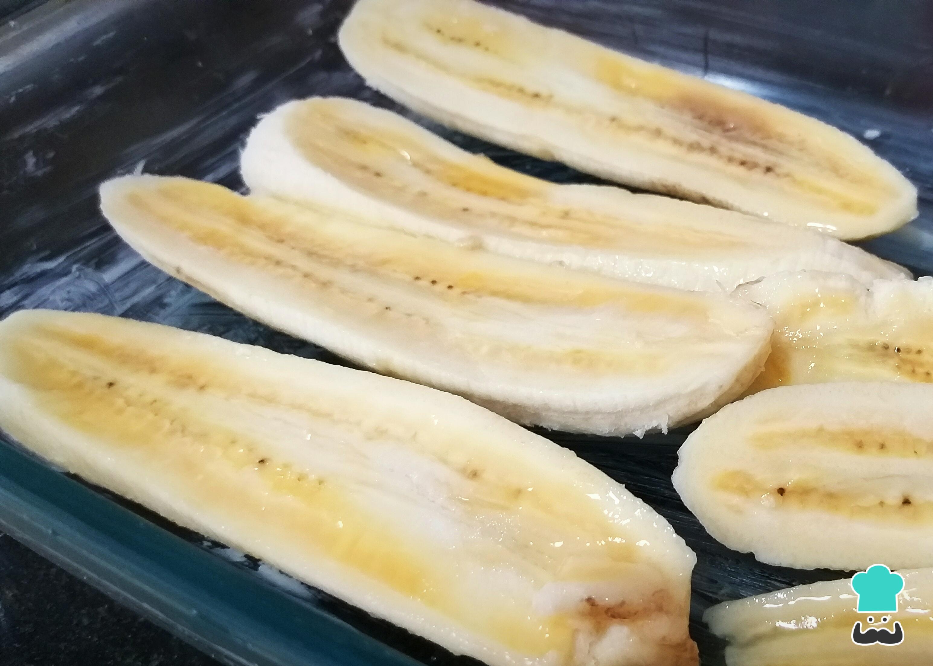 Corte as bananas ao meio, disponha em uma forma untada com manteiga e pingue algumas gotas de limão nas bananas.