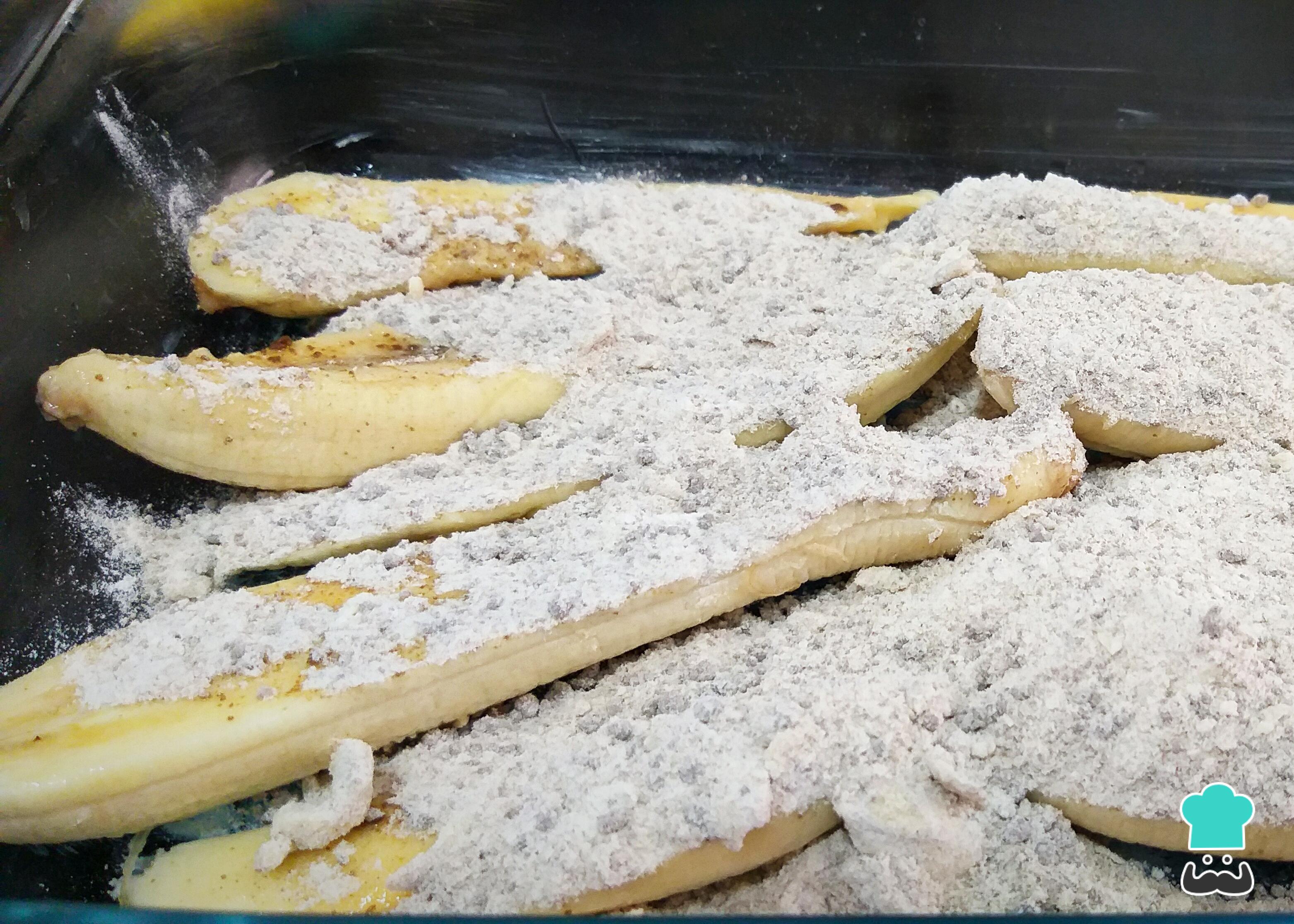 Coloque a mistura dos ingredientes secos por cima das bananas.