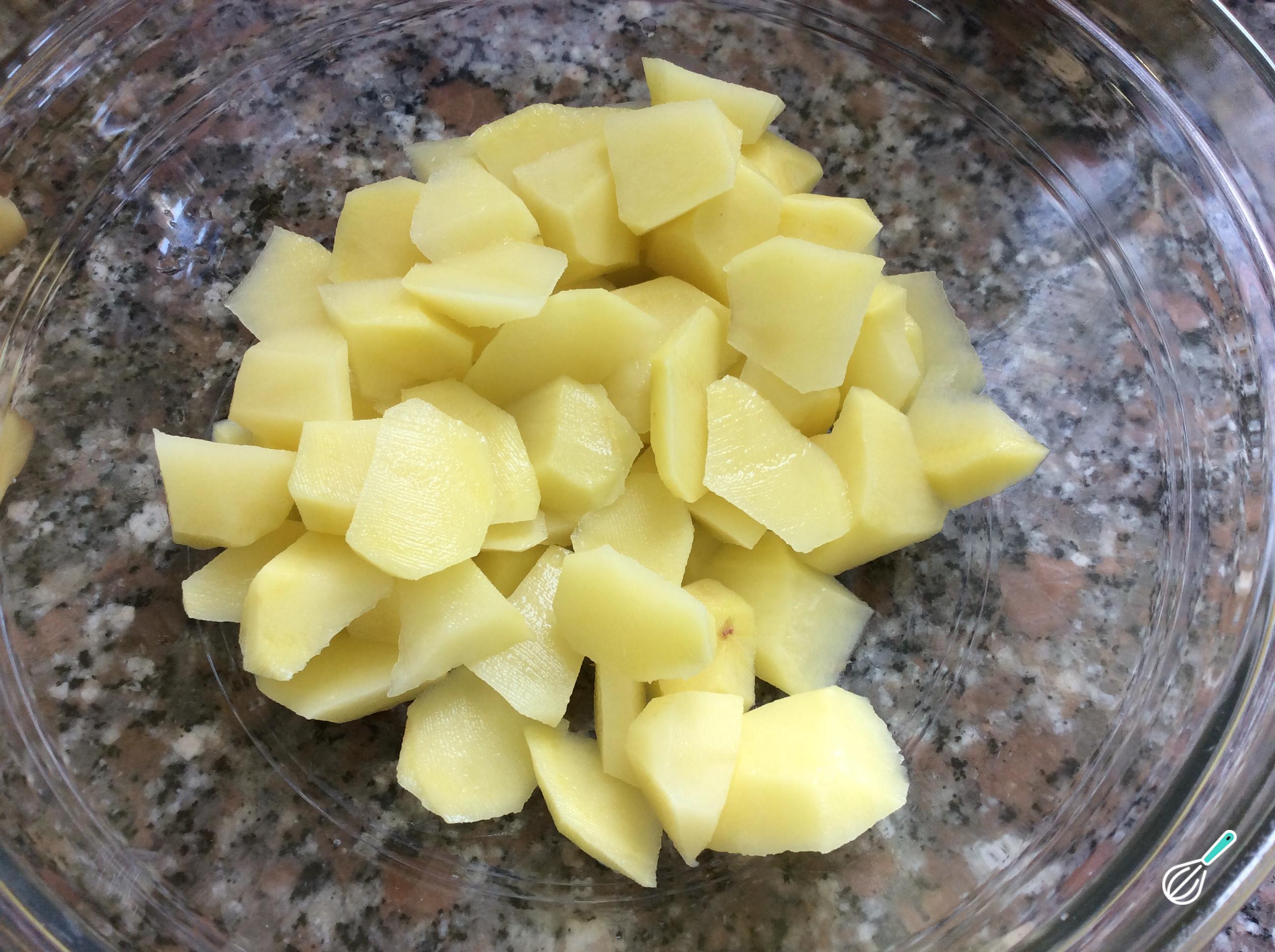 Lave e descasque as batatas, e corte-as a gosto. Você pode as cortar em fatias, mas eu geralmente opto por fazer cortes irregulares, por ser mais fácil.