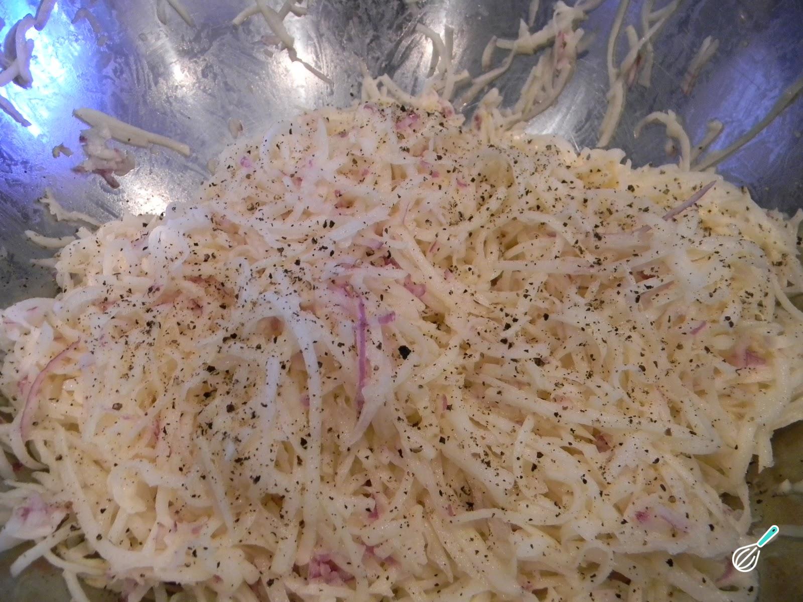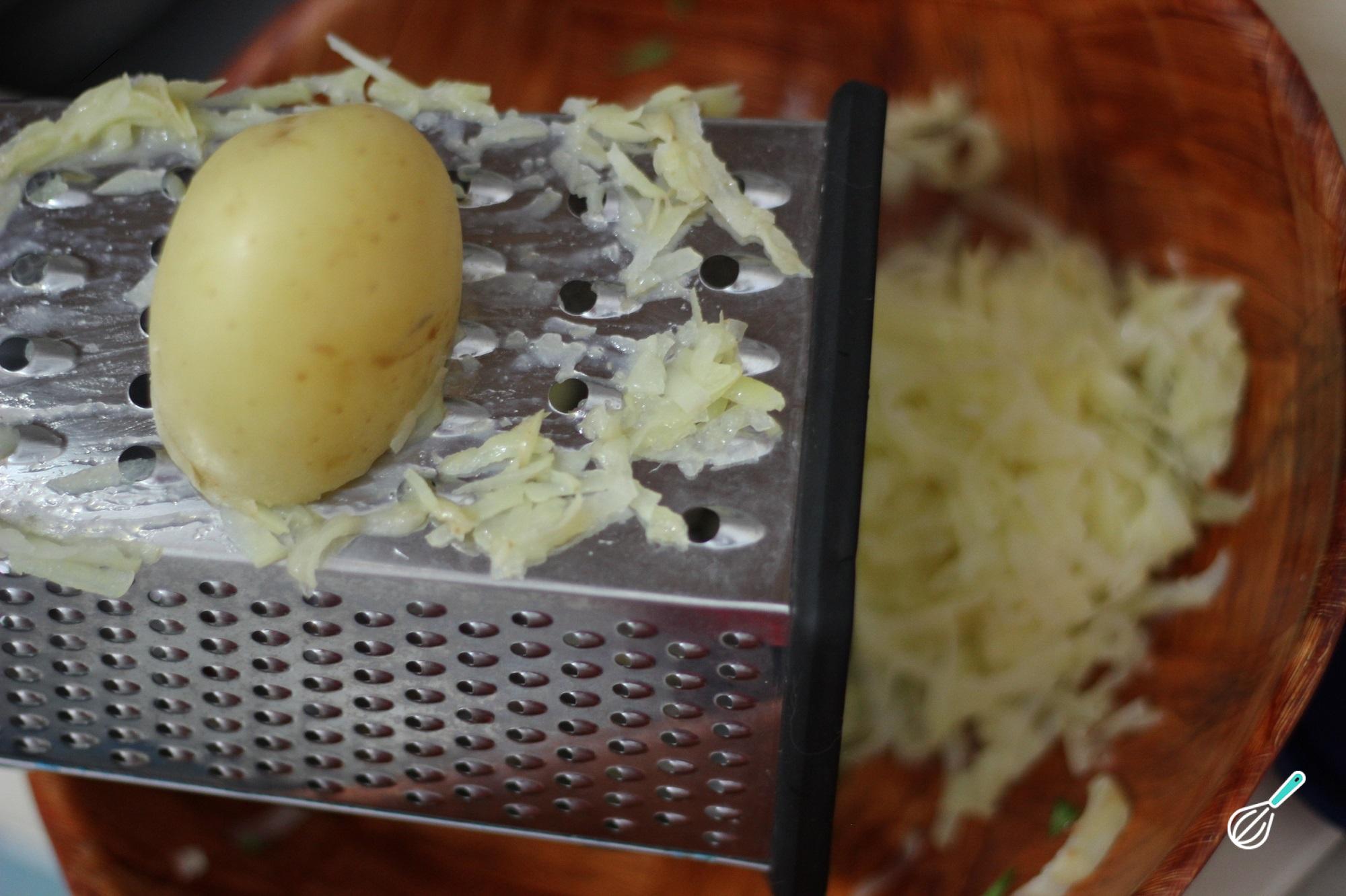 Como em qualquer receita, o primeiro passo é juntar os ingredientes. De seguida, rale a batata com um ralador fino e a cebola com um ralador médio. Por fim, pique finamente o alho.