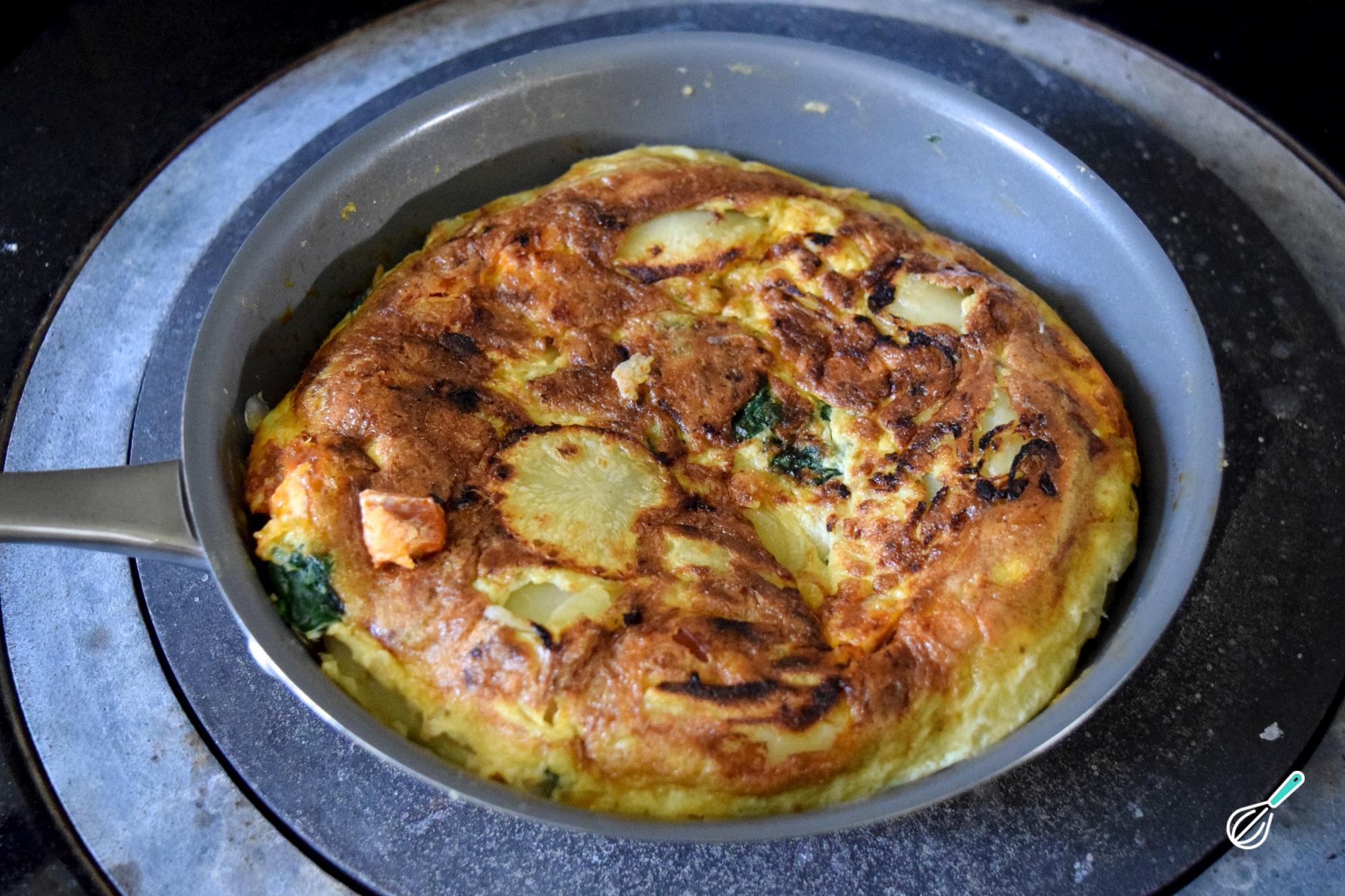 Volte a esquentar a frigideira com óleo e despeje a mistura anterior. Pressione a mistura na frigideira para que ganhe formato de tortilha e cozinhe em fogo médio até dourar. De seguida, vire a tortilha de espinafre e deixe cozinhar até estar pronta.