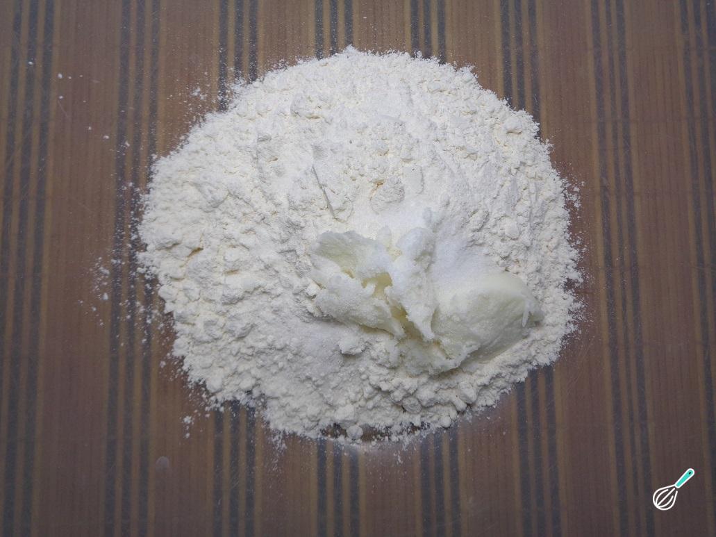 Em uma taça coloque, a farinha, o sal e a manteiga vegetal. Misture bem até que fique com uma textura grumosa. É importante que use uma manteiga 100% vegetal, uma vez que a textura desta manteiga, para a de origem animal é diferente e poderá alterar o resultado da receita.