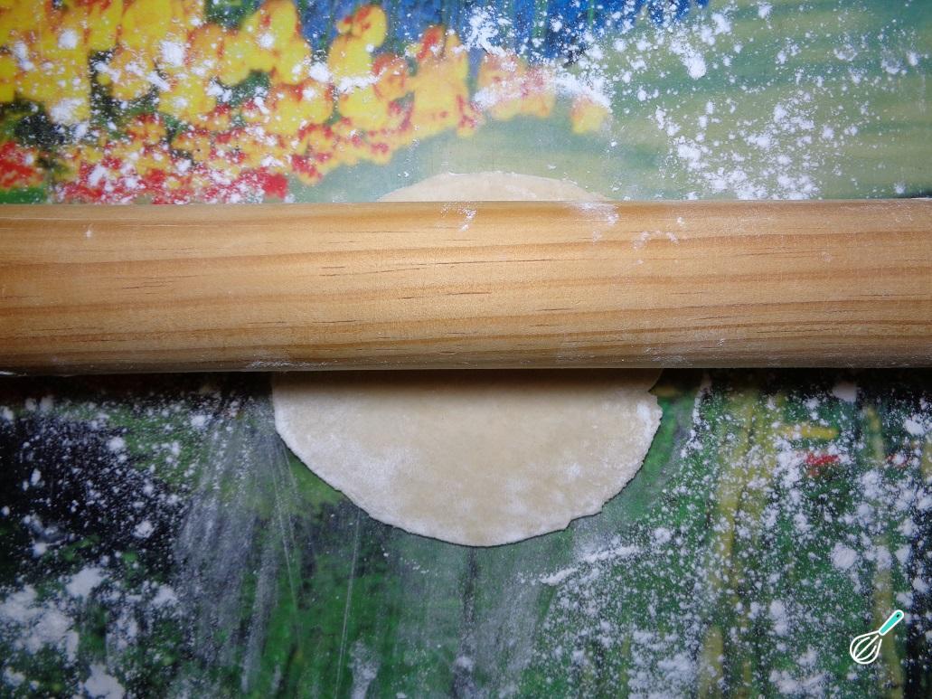 Com as bolas prontas, estique cada bola, com a ajuda de um rolo sobre uma superfície plana, a qual deve de estar um pouco enfarinhada.