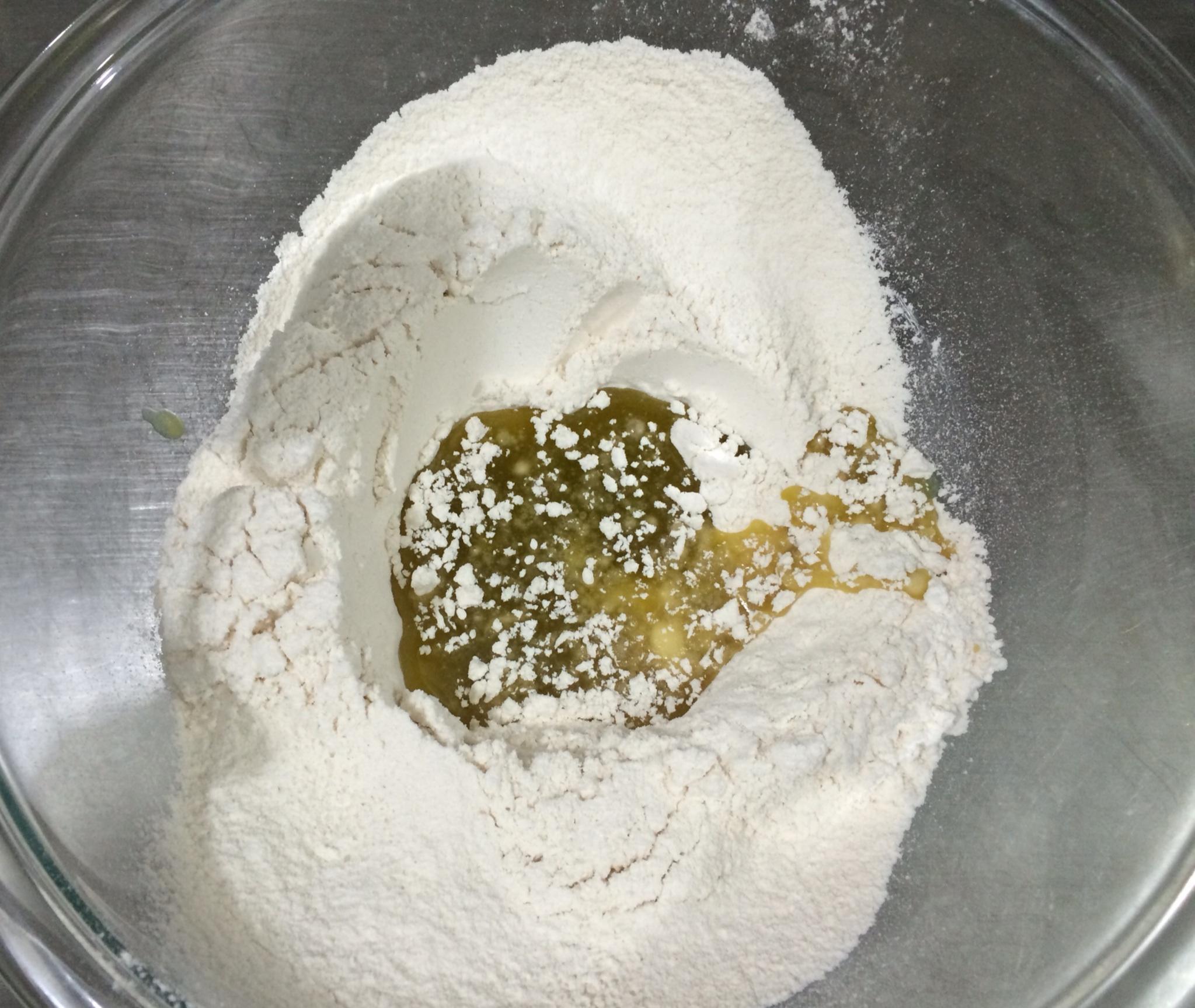 Peneire a farinha na direção de uma tigela e adicione-lhe o sal. Abra um buraco no centro e verta nele o azeite, pouco a pouco misture com a farinha em movimentos circulares a começar do centro.