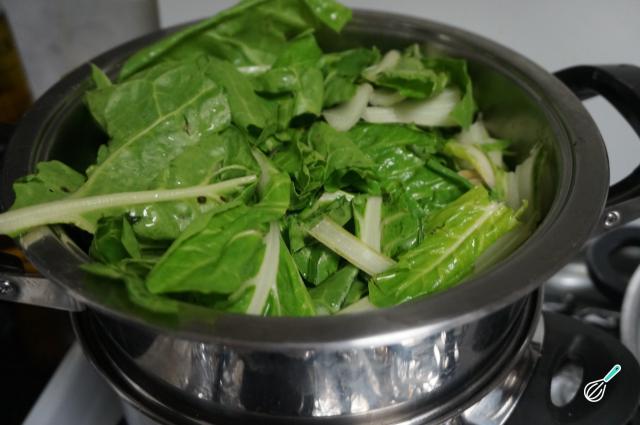 Em seguida coloque a acelga numa panela com água e sal e cozinhe até que as folhas fiquem tenras (cerca de 10 minutos após ferver). Após esse tempo, escorra a água e reserve a acelga.