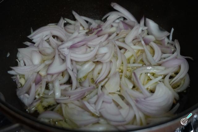 Descasque a cebola e os alhos e corte-os em tiras (corte juliana). Em seguida, refogue-os em 2-3 colheres de sopa do mesmo o azeite/óleo usado para fritar as batatas, até que fiquem macios e levemente dourados.