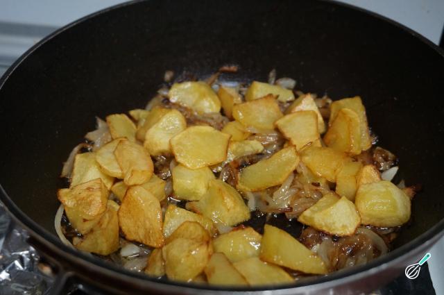 Adicione as batatas fritas no refogado de cebola e alho, tempere com um pouco de sal e baixe o fogo.