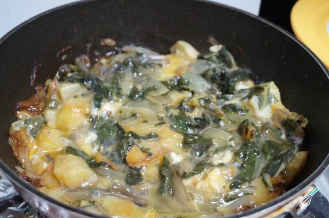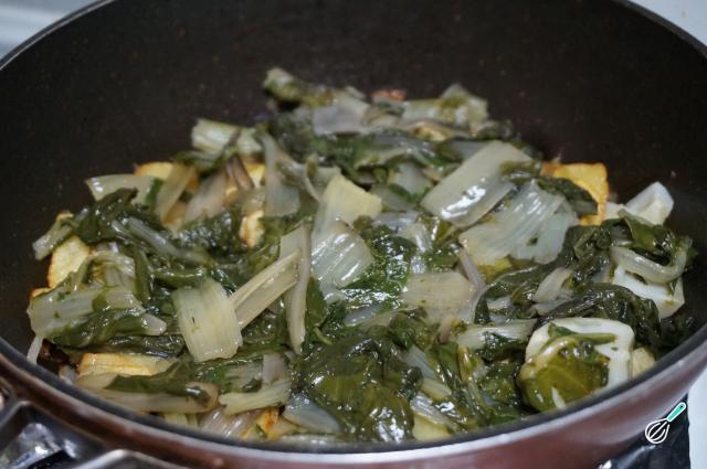 Sobre as batatas acrescente a acelga cozida e escorrida, espalhando bem, para formar uma camada. Neste momento, se você quiser, pode adicionar uma colher de chá de páprica doce ou ardida, se quiser que a acelga tenha um gostinho extra!
