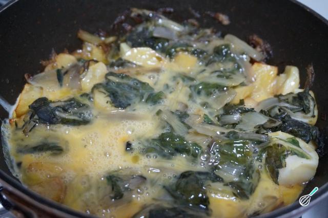 Bata os ovos à parte e tempere-os com um pouco de sal. Adicione os ovos na panela ou frigideira e deixe que cozinhem, sem mexer, mantendo o fogo baixo.