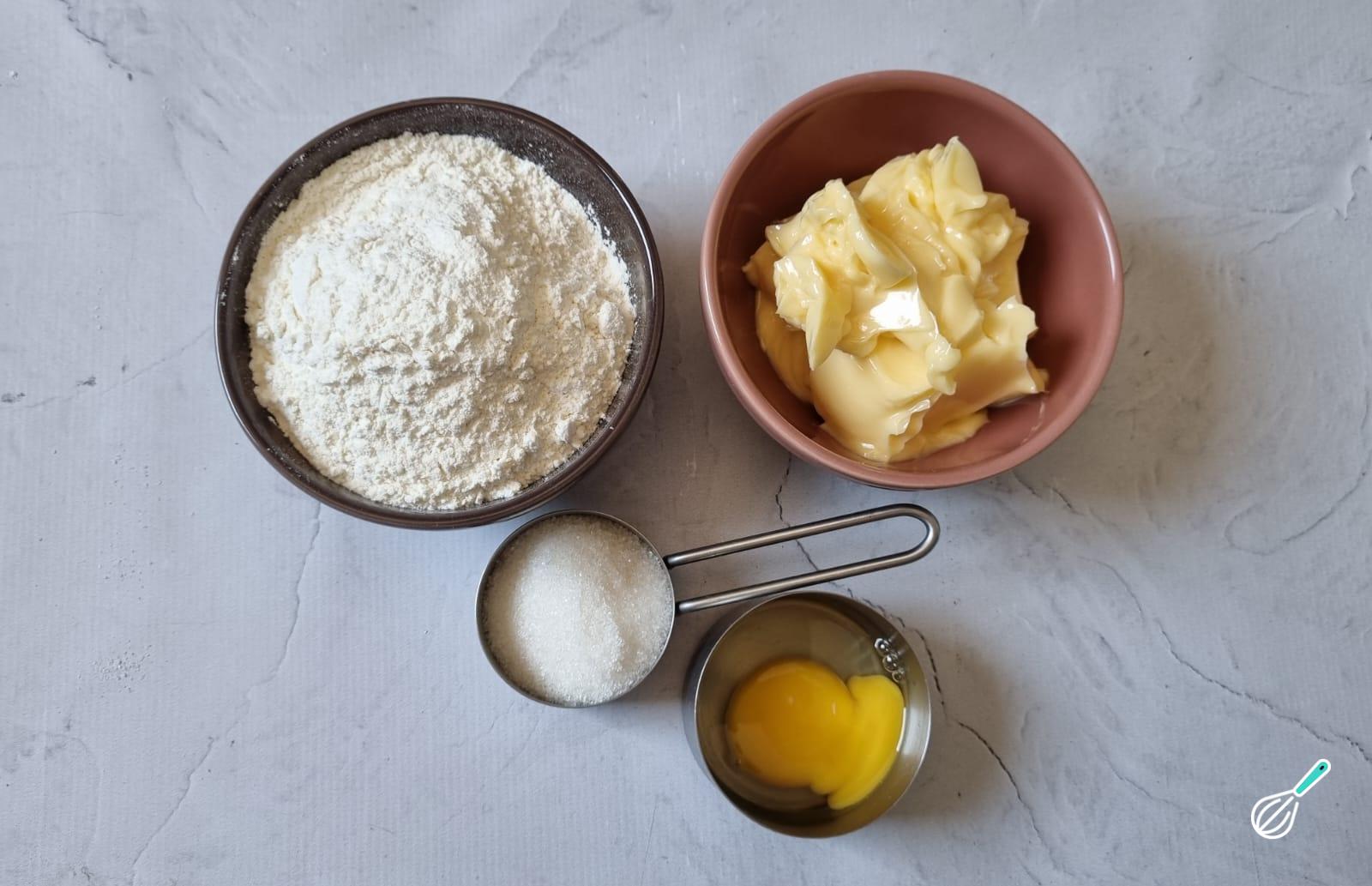 Após separar todos os ingredientes, preaqueça o forno a 180 graus. Comece pela massa: junte o açúcar e a farinha, misture até formar uma farofa e acrescente o ovo, misture até formar uma massa lisa e homogênea.