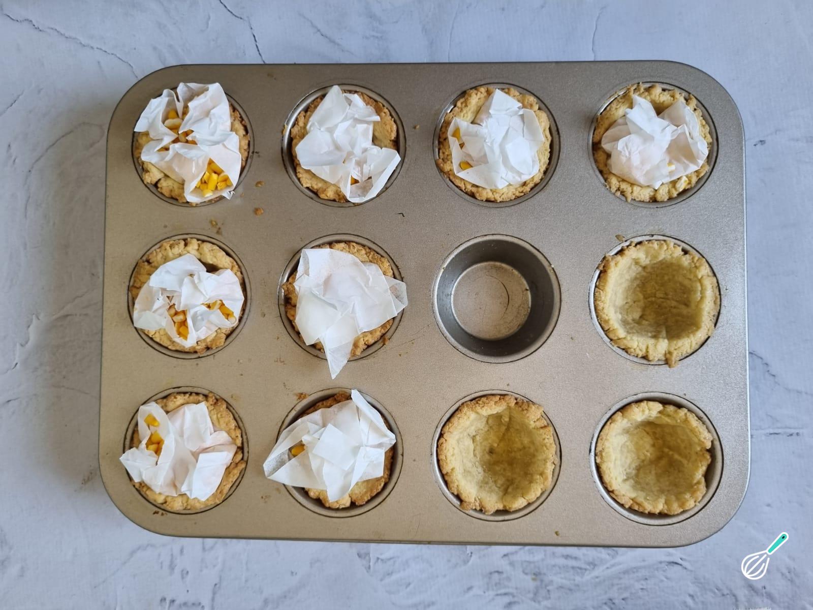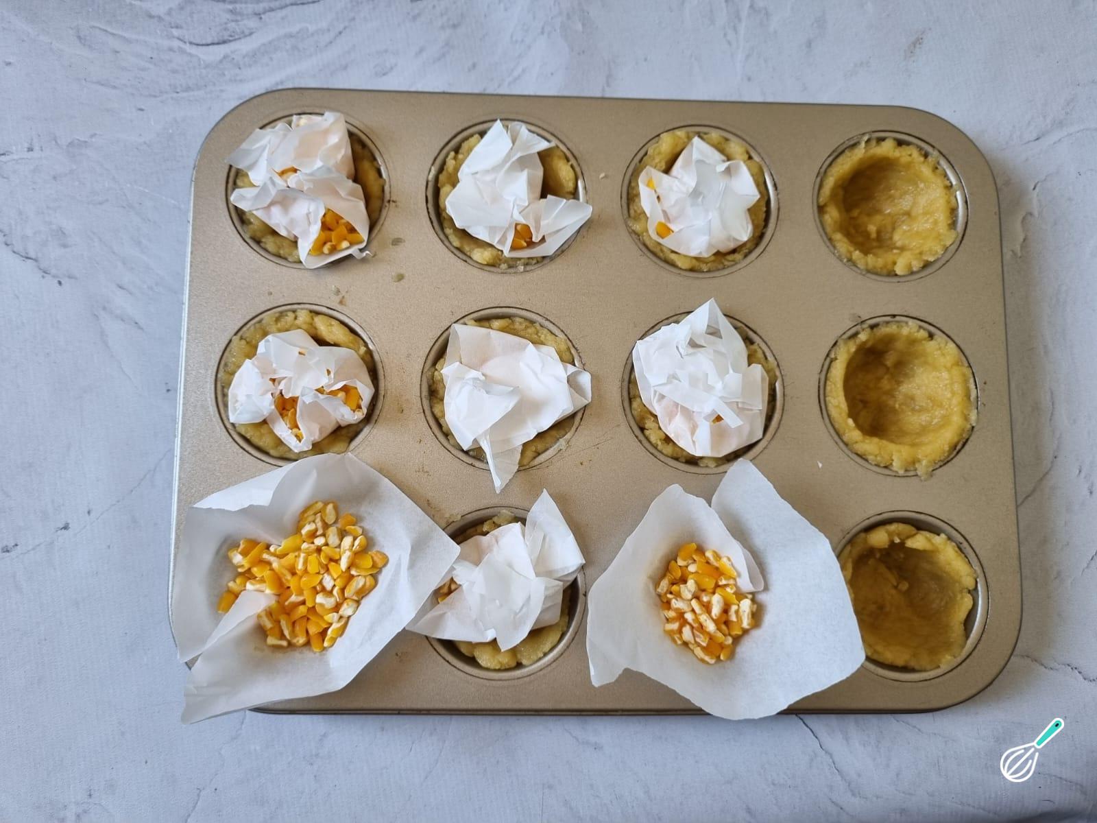 Cubra com papel manteiga e preencha com qualquer grão, para fazer peso ao assar e impedir a massa de inflar.