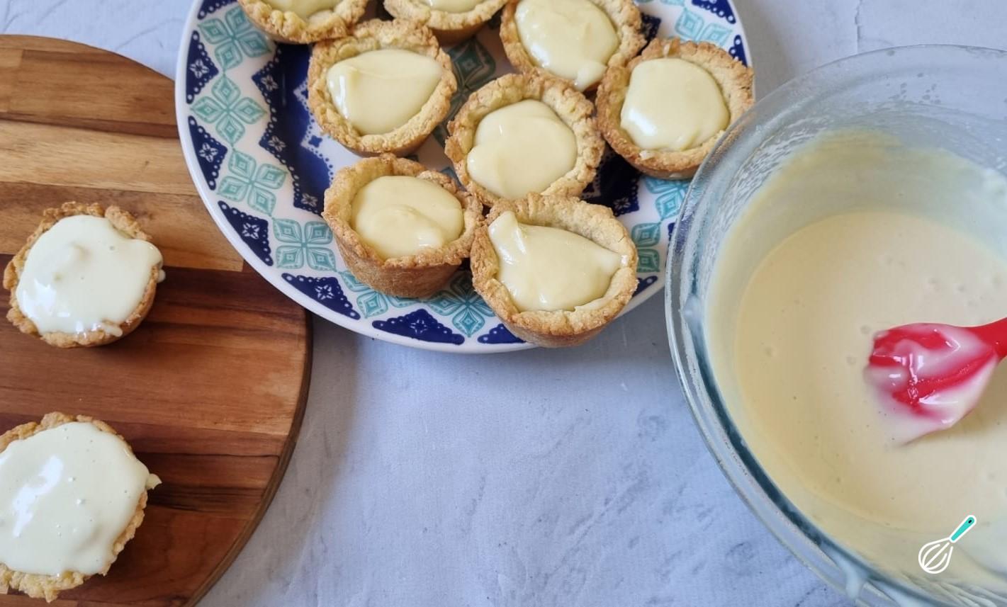 Coloque a cobertura por cima das tortinhas recheadas. Os cremes devem estar em temperatura ambiente ou frios. Após cobrir as tortinhas, leve para gelar até a hora de servir.
