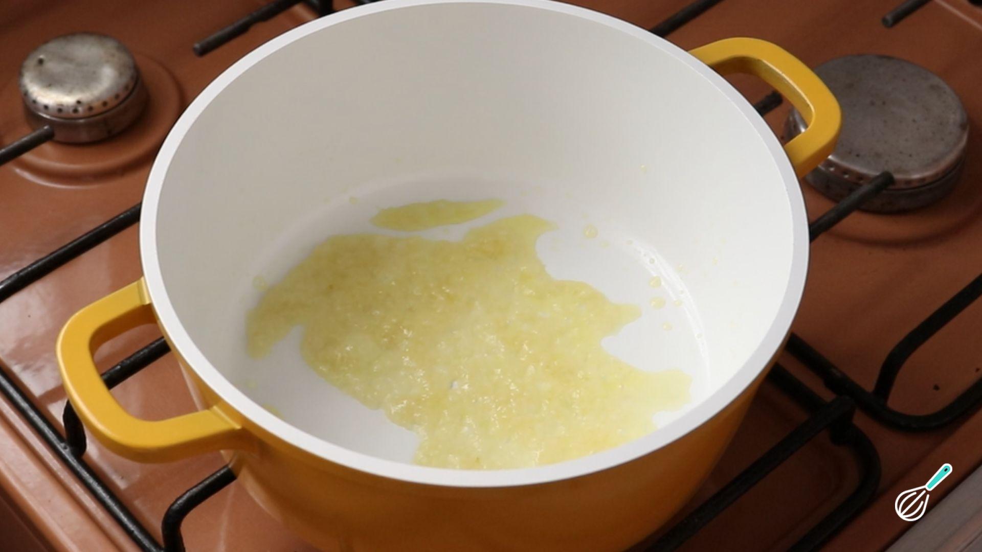 Comece preparando o recheio da sua tortinha de frango integral. Refogue o alho e a cebola em um fio de azeite.
