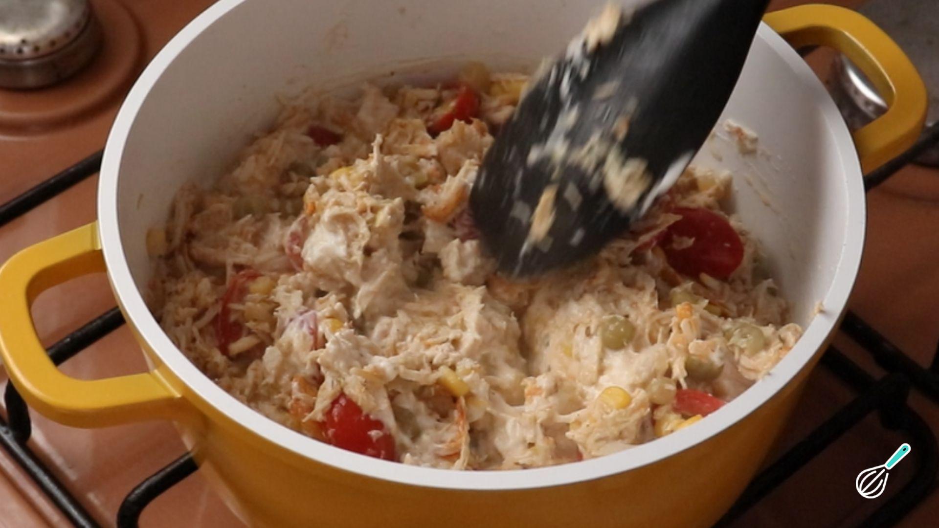 Junte o tomate, o milho, a ervilha e tempere com sal e pimenta. Finalize com o requeijão.