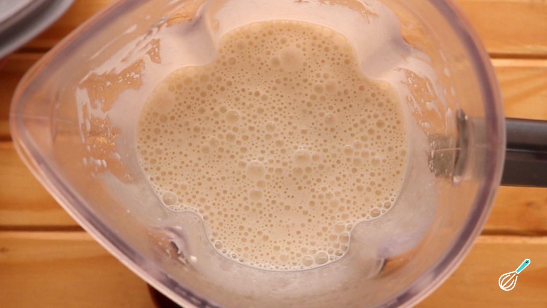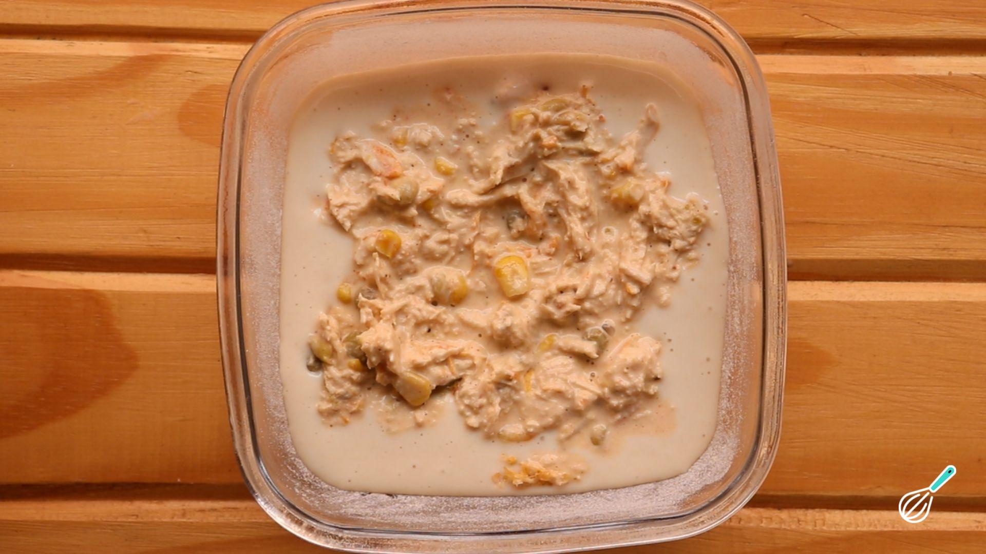 Enquanto o recheio esfria, prepare a massa da sua tortinha de frango integral. Coloque no liquidificador, o leite, os ovos, o óleo, a farinha, o fermento e o sal e bata até ficar homogêneo.
