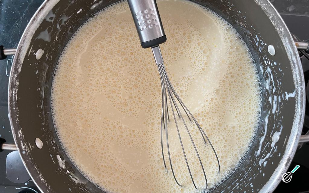 Misture os ingredientes com um batedor e leve ao fogo médio, mexendo sem parar.