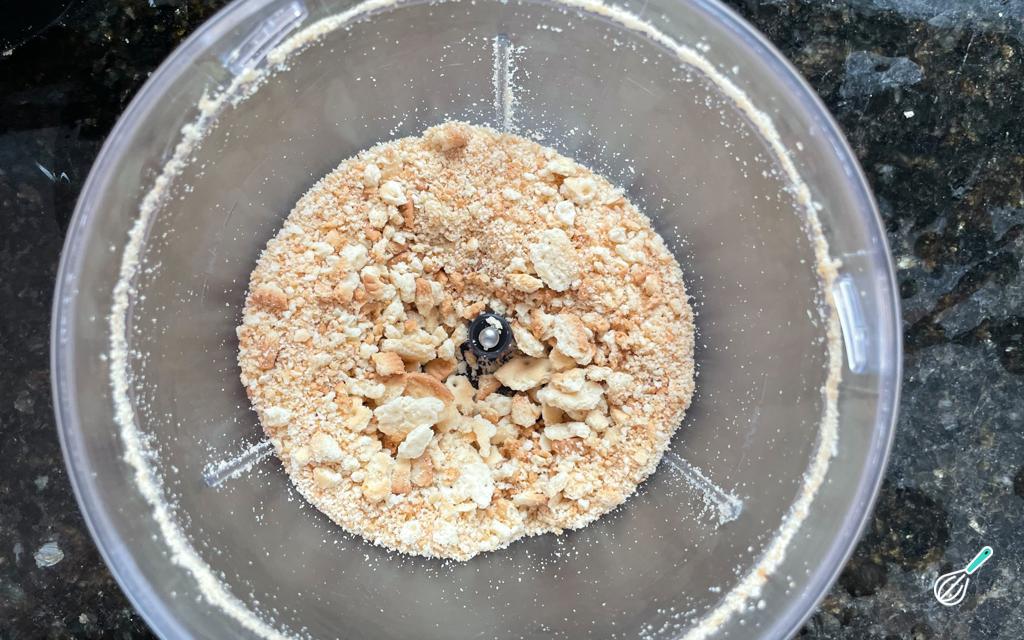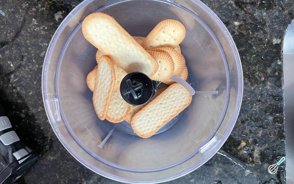Coloque os biscoitos num liquidificador ou processador.