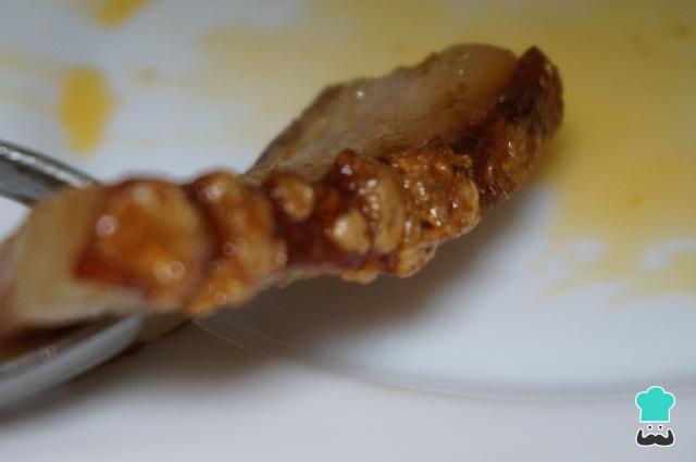 Após esse tempo, todo o toucinho deverá ficar com a pele frita, crocante e com pequenas bolhas de ar, como na foto. Retire para um prato.