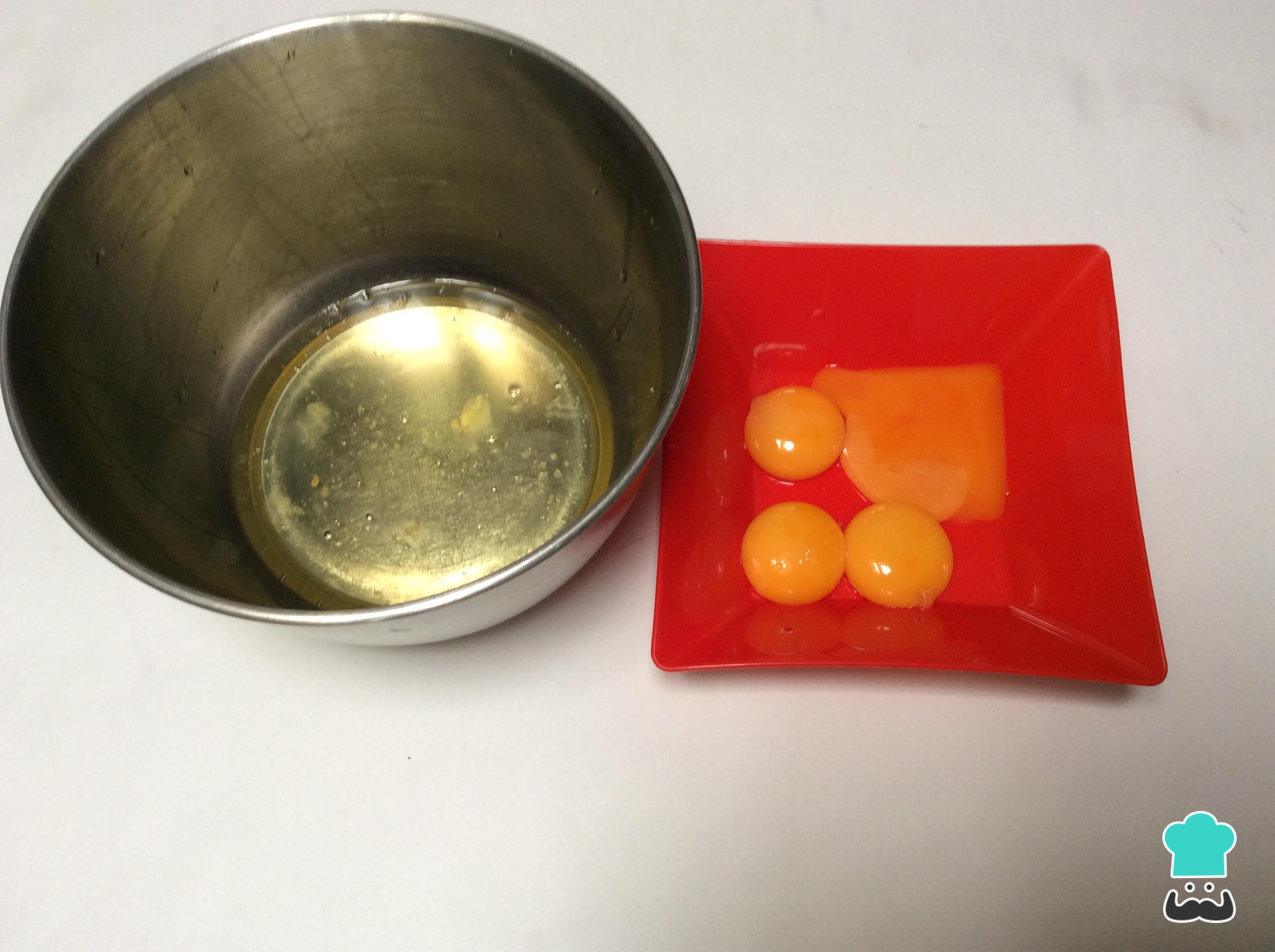 Em seguida separe cuidadosamente as claras das gemas e, se quiser, peneire as gemas para evitar o cheiro e gosto de ovo.