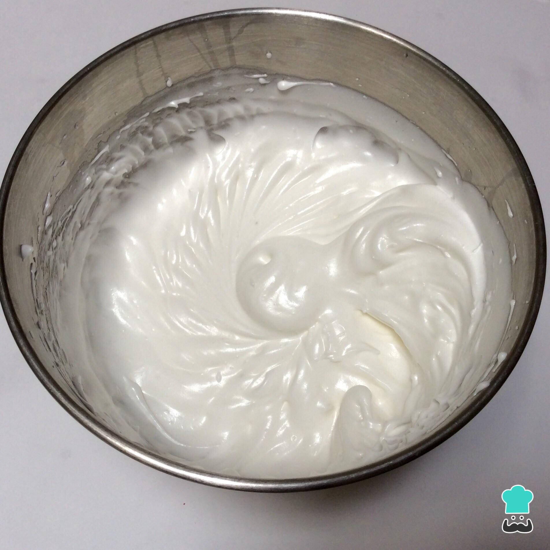 Prepare um merengue com as claras: acrescente uma pitada de sal e bata-as em neve com a ajuda de uma batedeira elétrica. Quando estiverem firmes acrescente o açúcar cristal enquanto bate e continue batendo até obter um creme brilhante que forma picos. Se tiver dúvidas confira a receita passo a passo de merengue.