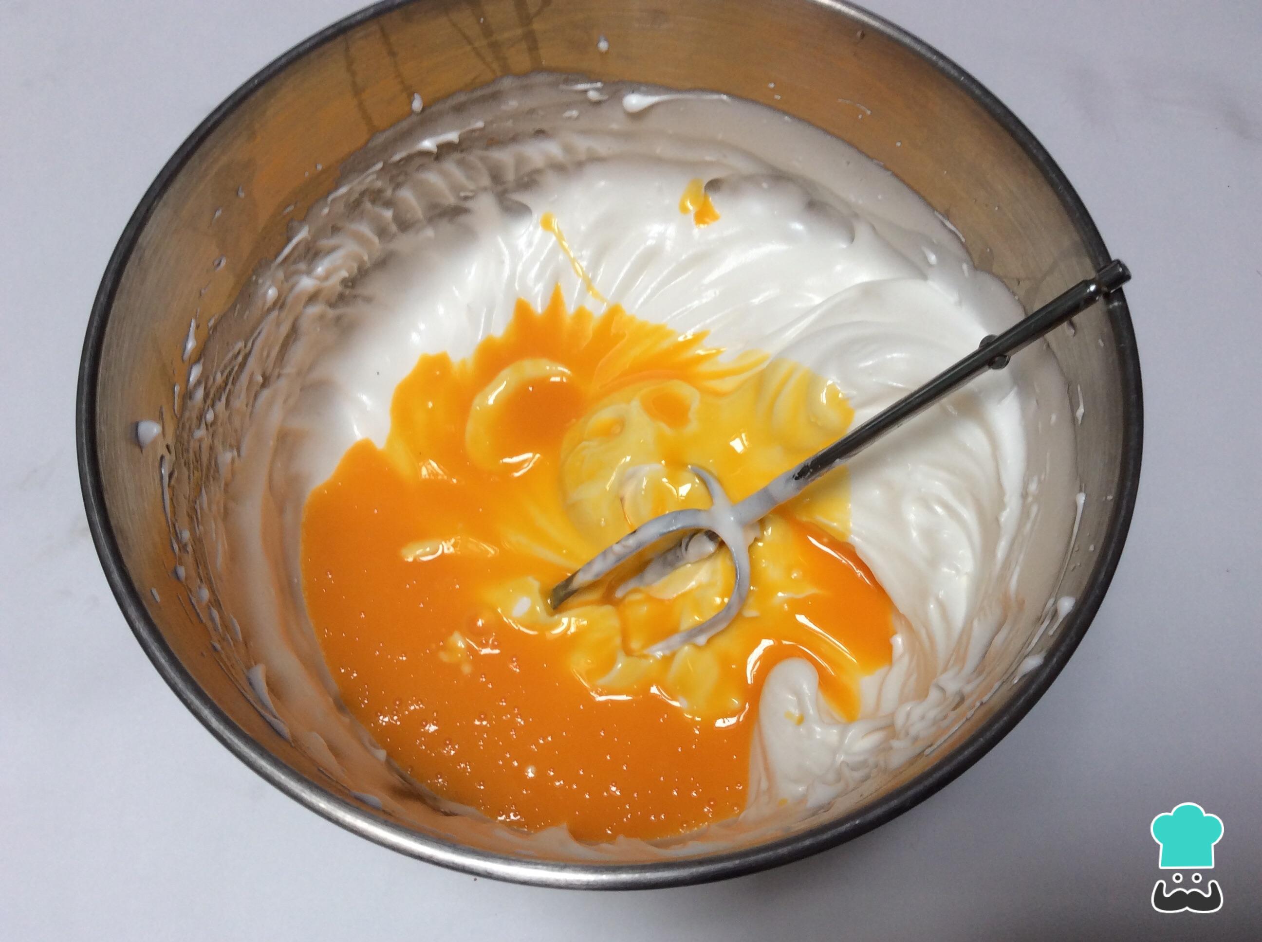 O passo seguinte desta receita de bolo de Natal é acrescentar as gemas ao merengue e misturar manualmente e de forma envolvente, para evitar que o merengue perca o ar e baixe de volume.