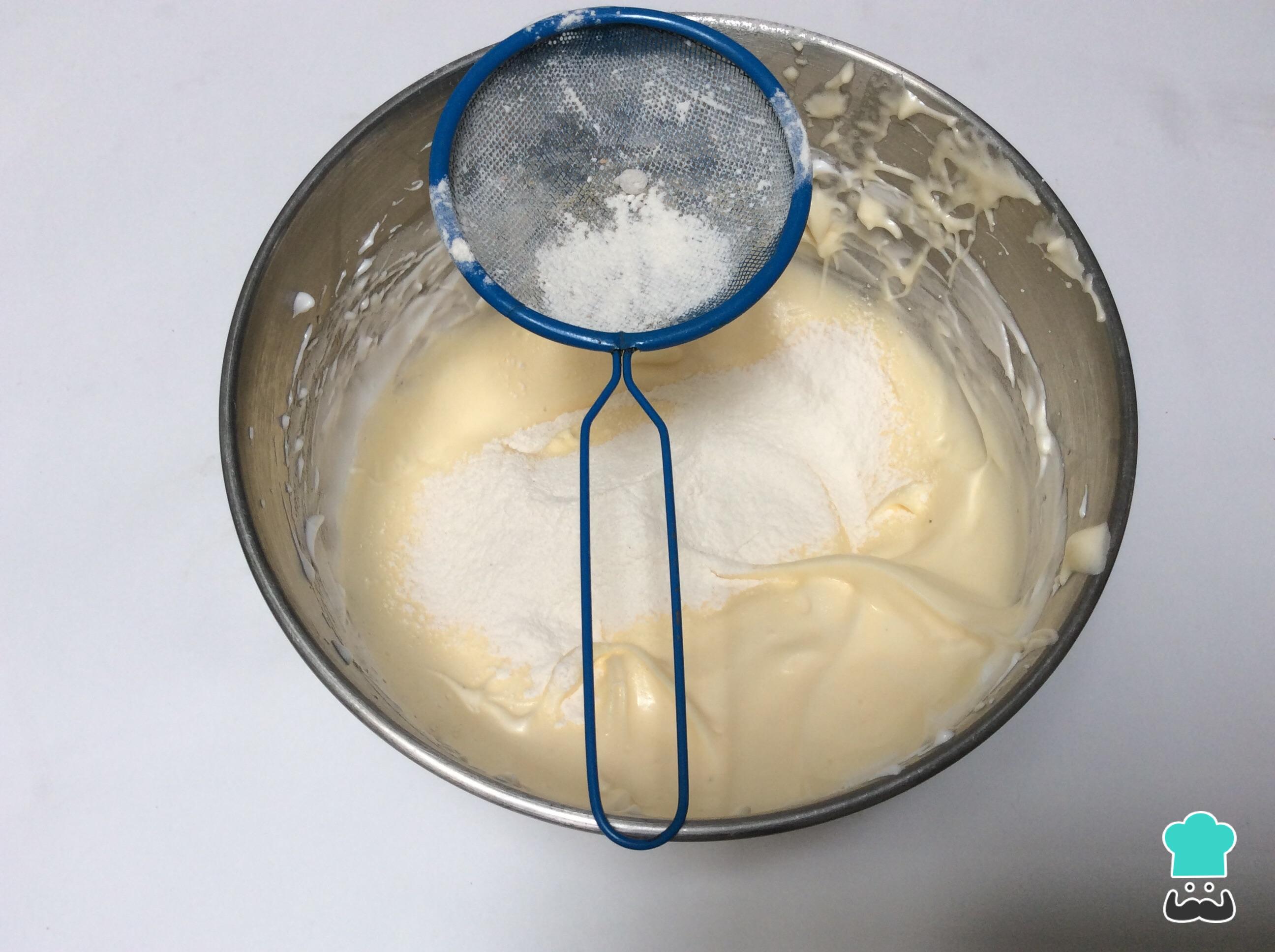 Assim que as gemas estejam bem integradas, adicione a farinha peneirada e misture novamente de forma envolvente.